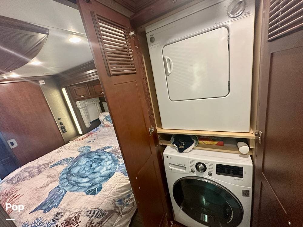 The bedroom features a king Sleep Number bed, dual wardrobes, a built-in dresser, and a washer and dryer for complete independence on the road.