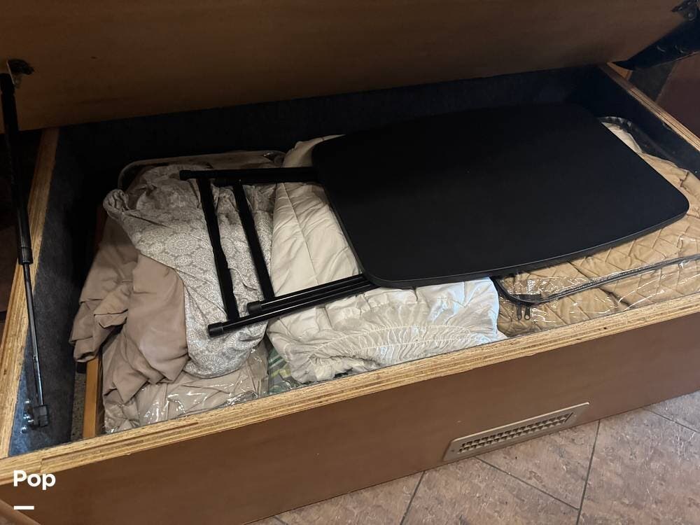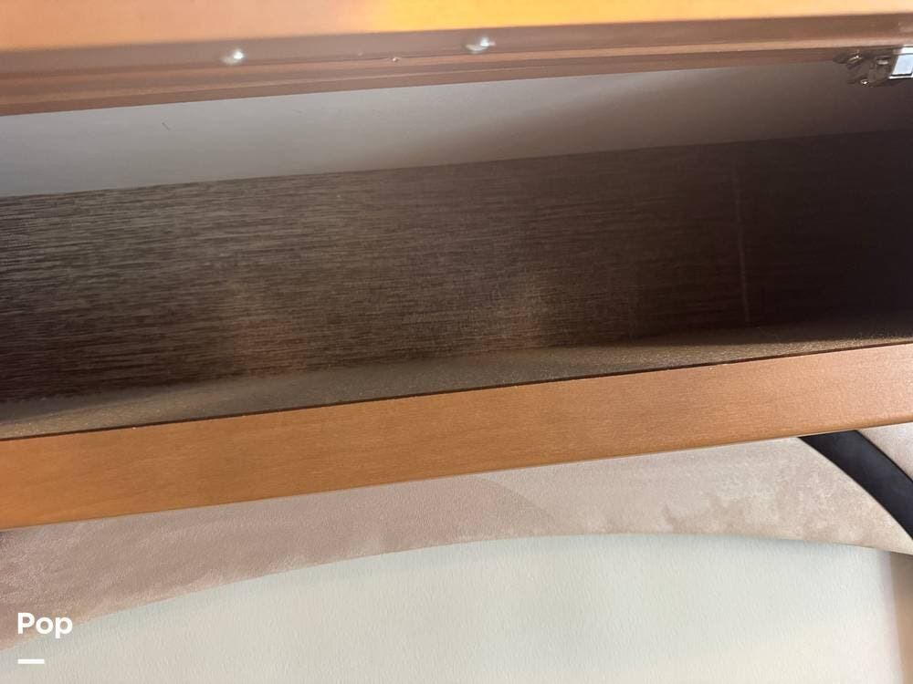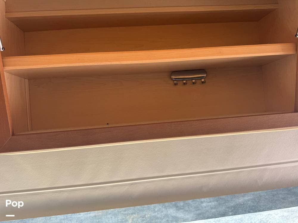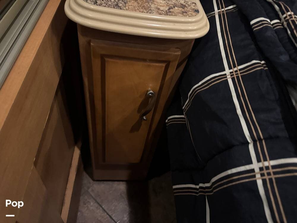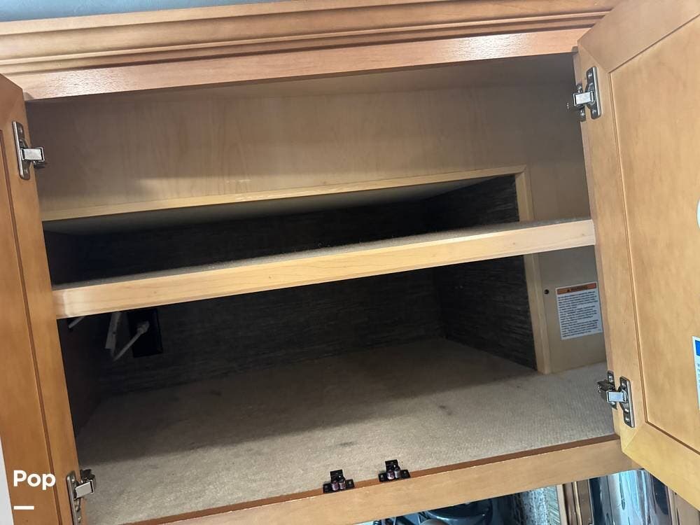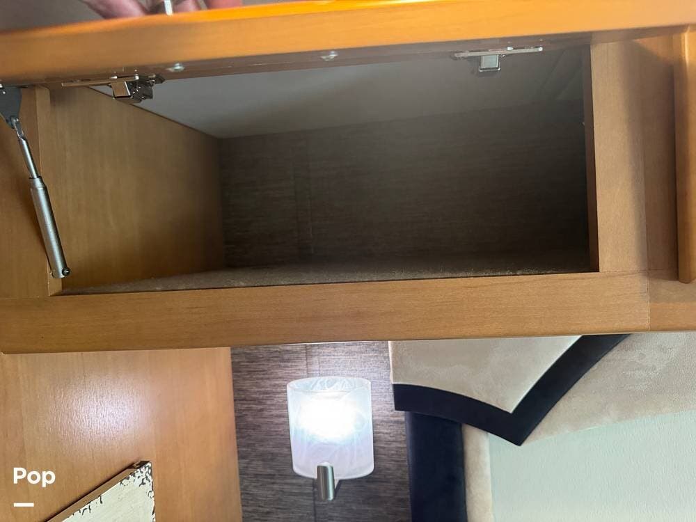 At the rear, the private master suite features a King-sized, walk-around bed with a deluxe pillow-top mattress that raises up for easier TV viewing or reading, overhead cabinets, and a full wall wardrobe. There's also a washer and dryer hidden behind the cabinet doors, a large dresser, and a TV for easy living on extended trips.