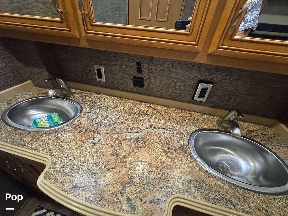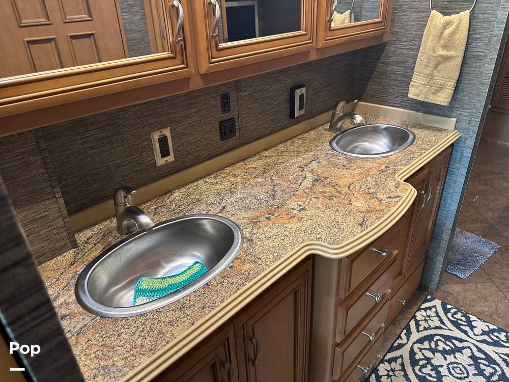 The split bathroom features a roomy glass-enclosed shower, a vanity with a medicine cabinet, and a porcelain toilet -- all finished in Newmar's refined style. The bathroom vanity area is next to the bedroom and features his-and-hers sinks, so it's easy to get ready together in the morning.