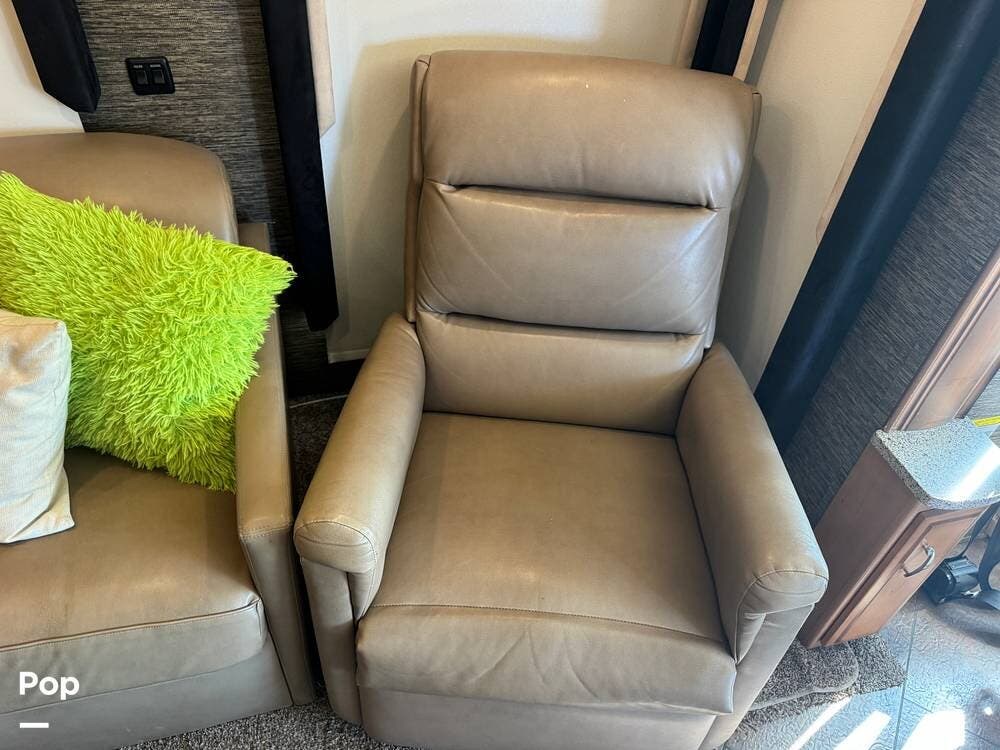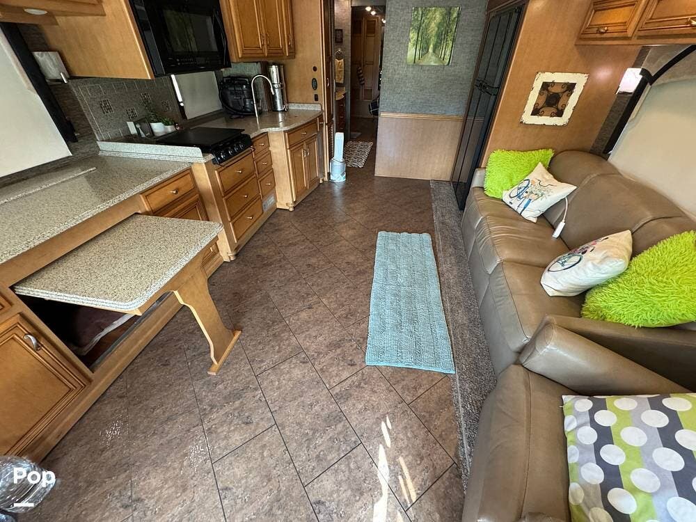 In the main living space, you'll find ultra-leather seating, including a comfortable sofa, a swivel recliner chair, and an expandable dinette table that easily seats four or more adults. The mid-coach flat-screen TV (on an elevator), surround sound, and day/night roller shades make it easy to unwind after a day on the road.
