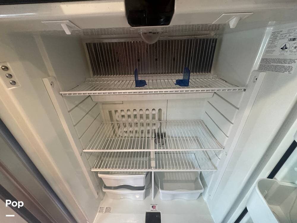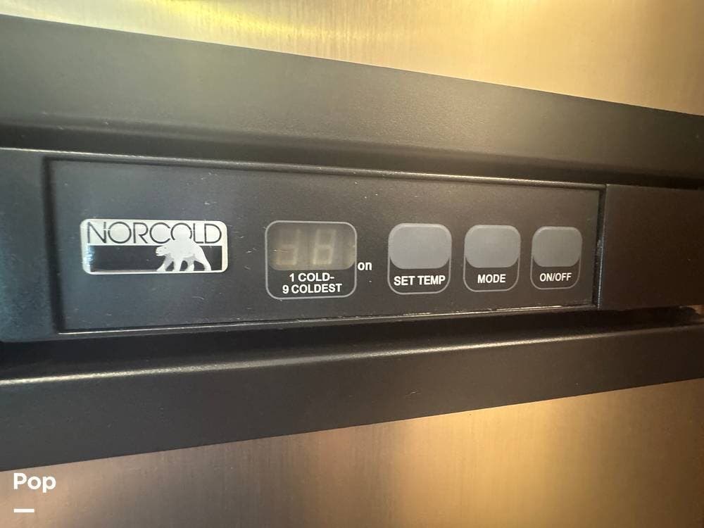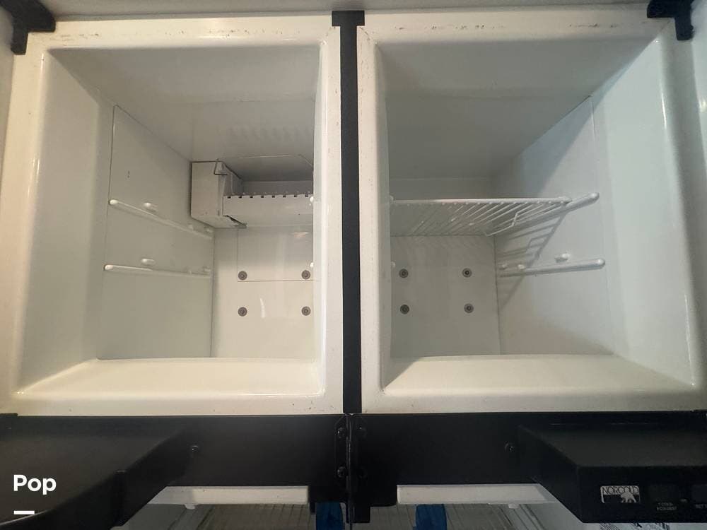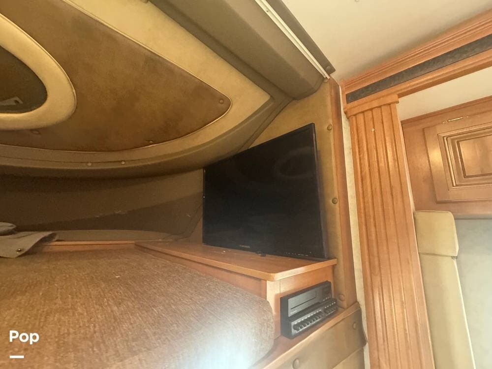 Toward the rear, a walk-around queen-size bed anchors the private bedroom suite, complemented by large wardrobes and a flat-screen TV. A roomy split bath features a stand-up shower with a glass door, a vanity, and a porcelain toilet, providing all the comforts of a traditional bathroom.