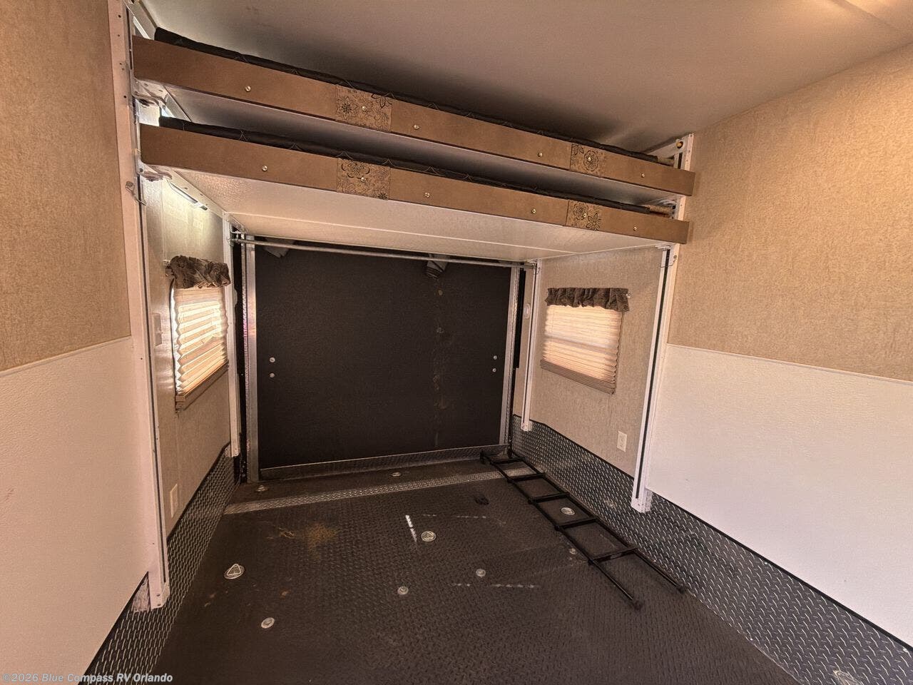 There are dual sets of steps on either side of the entertainment center that lead to the front master bedroom behind double sliding pocket doors. Inside find a queen bed with overhead storage, and dual bedside nightstands and shirt closets, plus so much more!