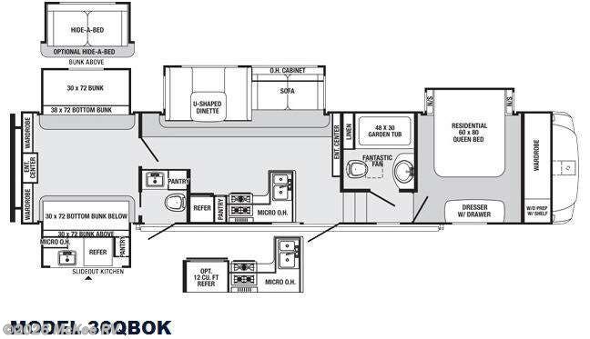 This Sabre bunkhouse fifth wheel is perfect for a larger family or one that likes to take along extra guests. Model 36QBOK is perfect with a bunkhouse that also includes a half-bath with private entry. The entire unit features quad slides for added space, one and a half baths, an outdoor kitchen, and sleeping for nine!