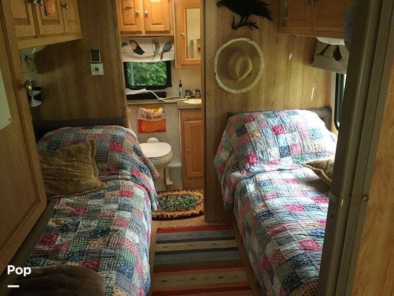 The RV is roomy, with one slide in the main living area. There are two twin beds in the midsection making a perfect double sleeping area easy to get in and out of bed.