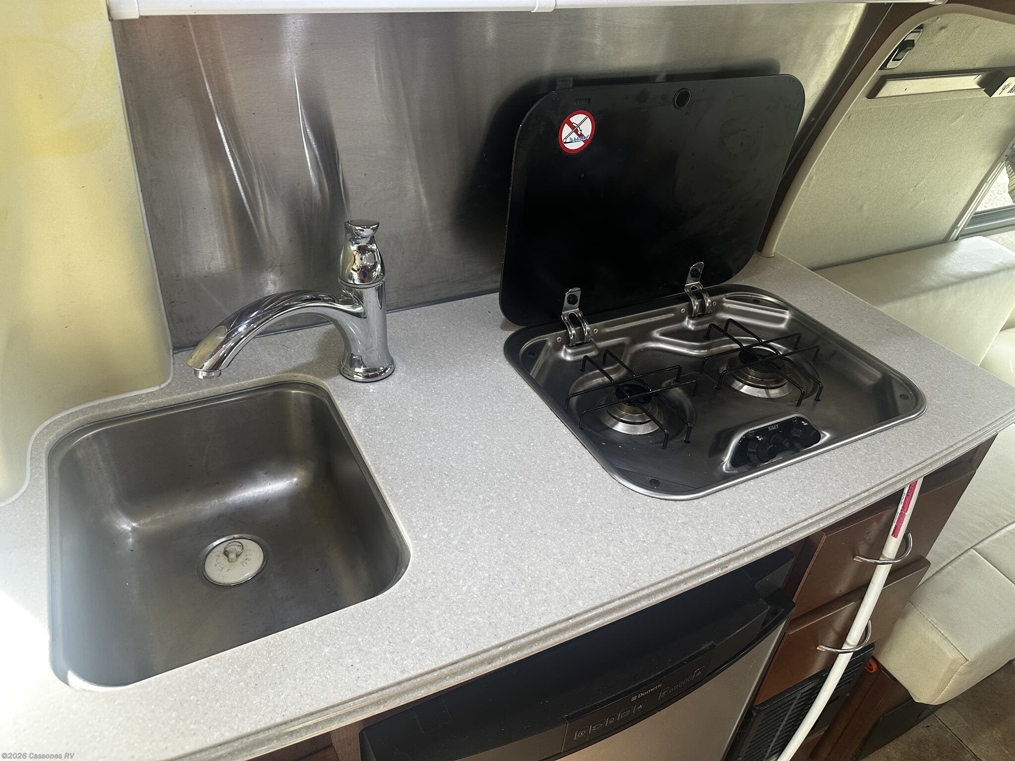 The well-equipped galley kitchen includes a two-burner cooktop, microwave oven, refrigerator/freezer, stainless sink, and generous cabinet storage, making meal preparation easy whether you're on the road or at the campsite.