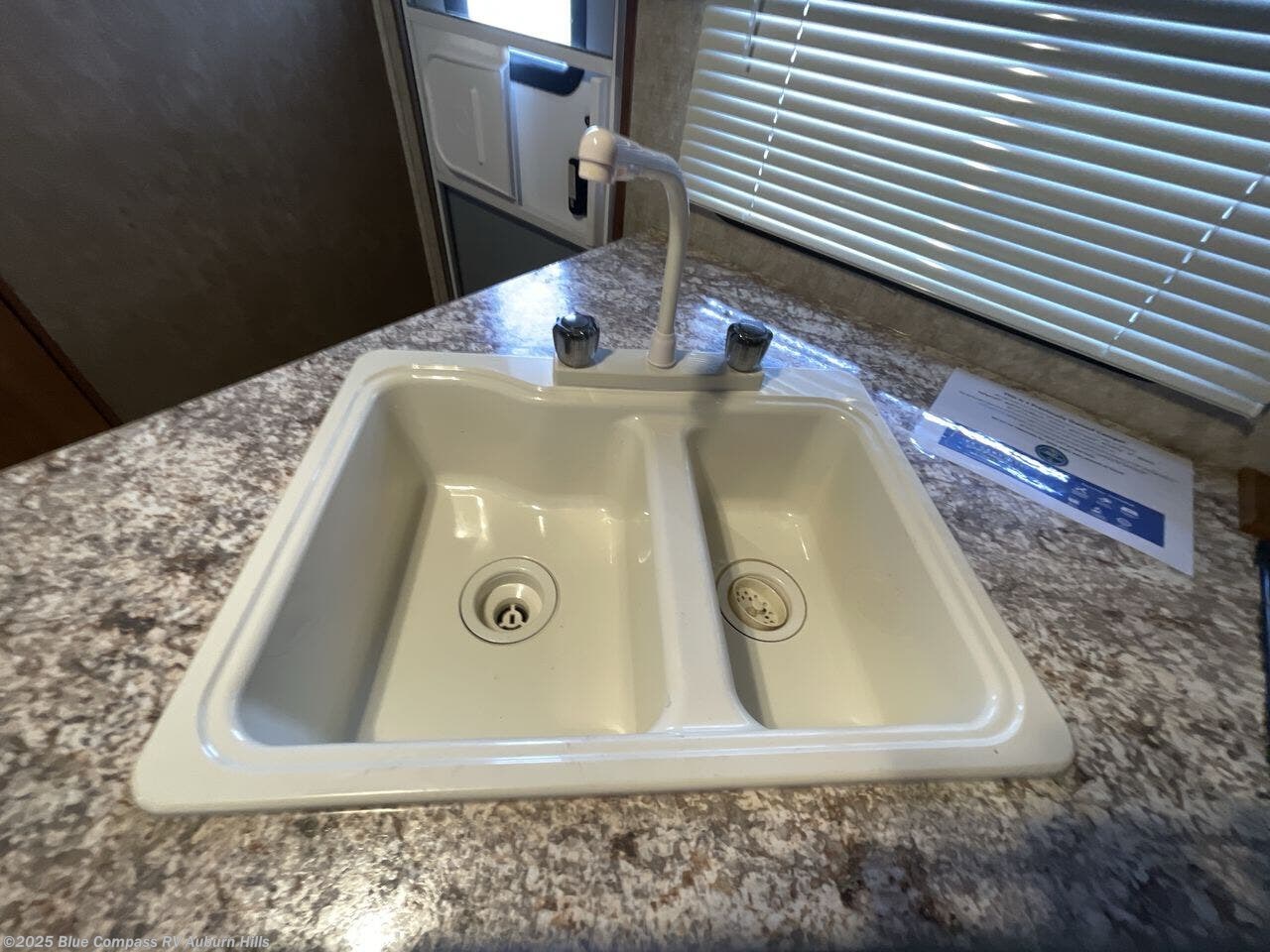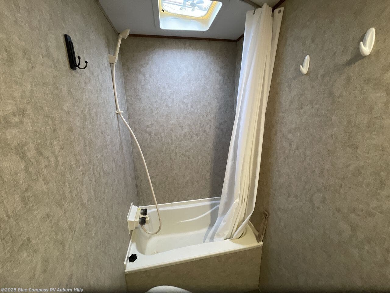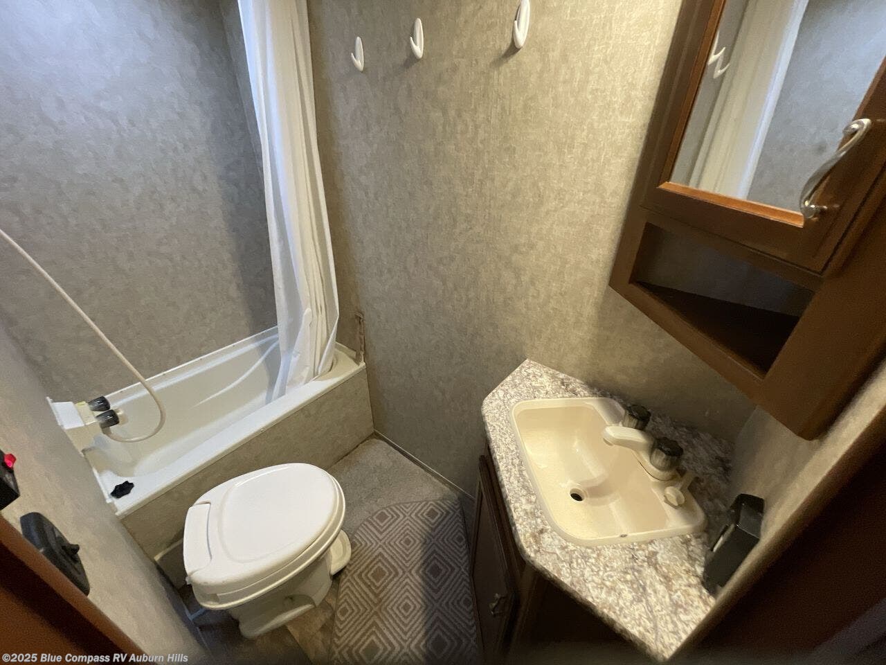 The rear of the travel trailer offers a bathroom with a sink outside of the bathroom. Inside the bathroom you will find a tub, and a toilet.