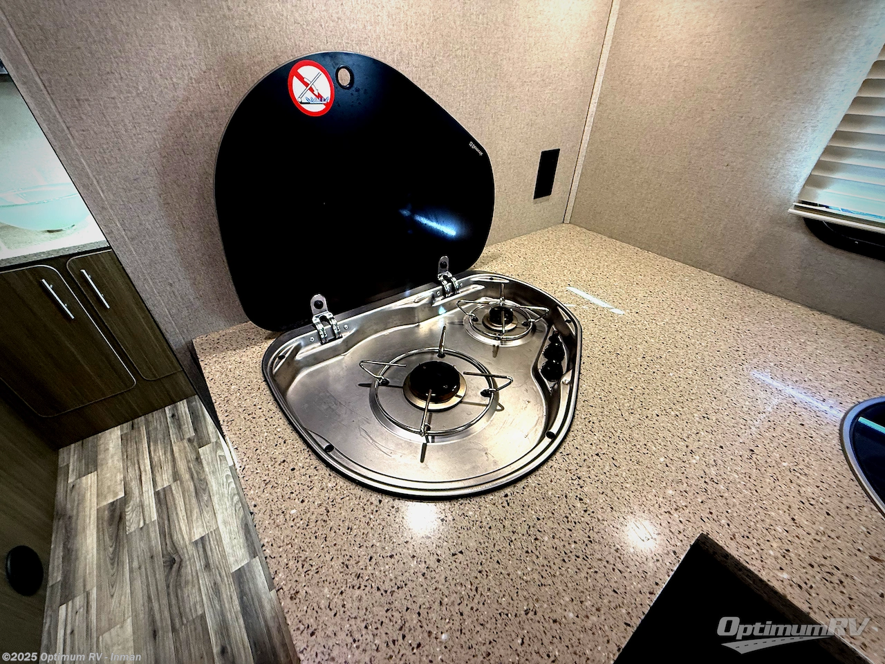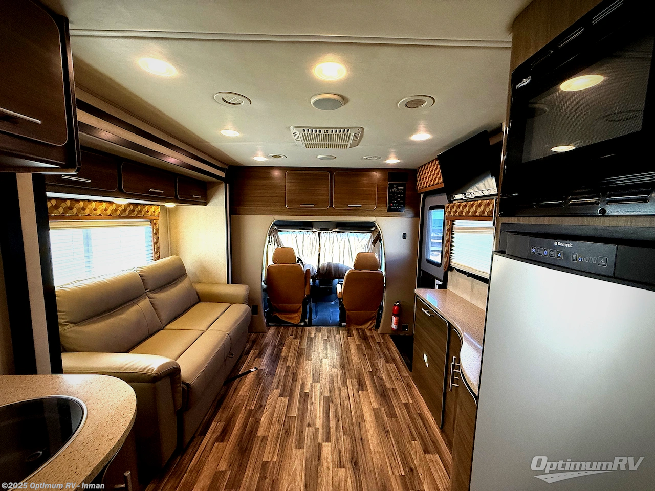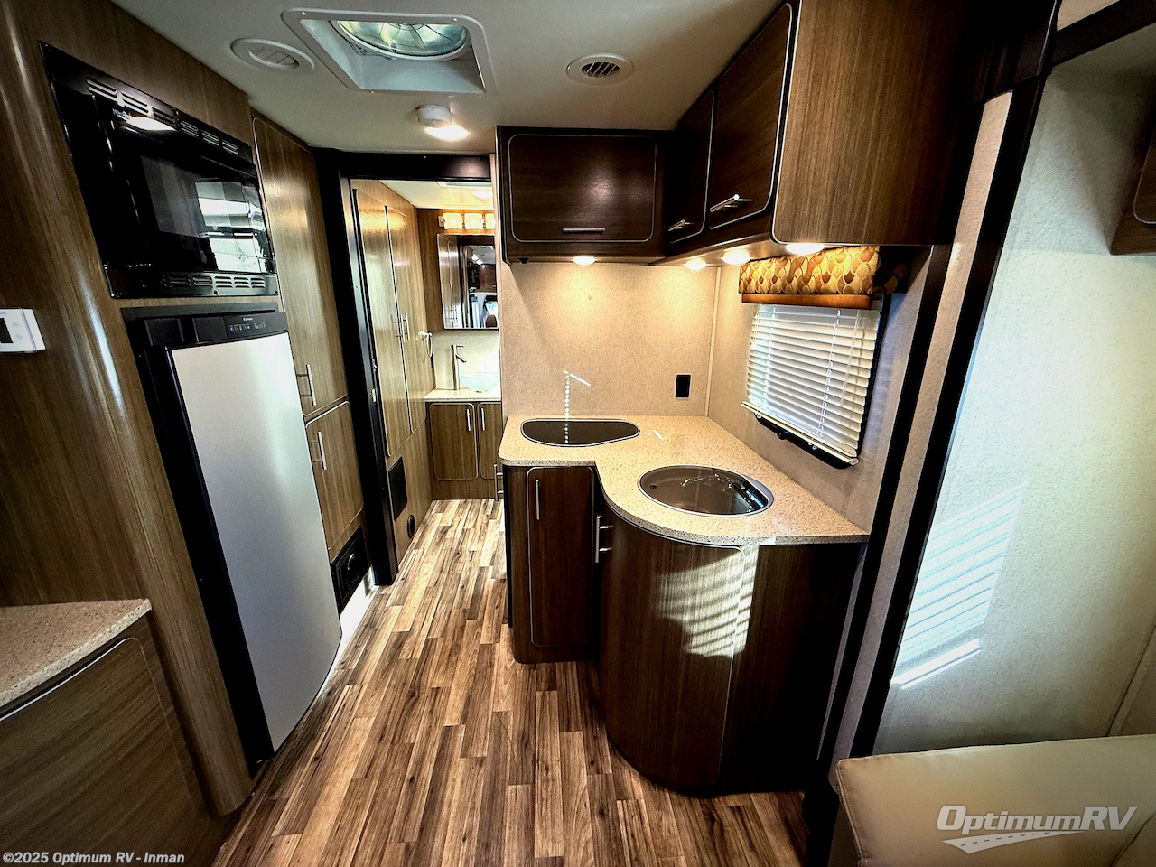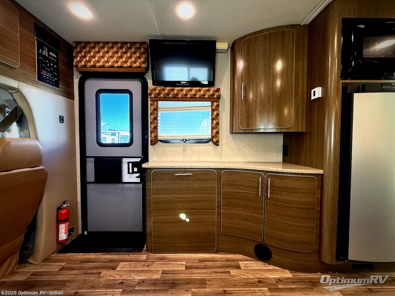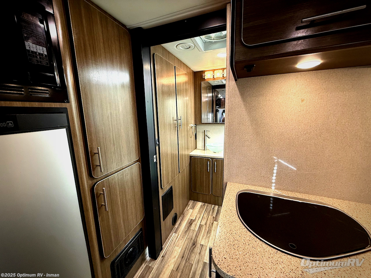 Step inside and find a kitchen area to the left of the door. There is a round sink, two burner cook-top, and 7 cu. ft. refrigerator with microwave oven. You will also enjoy storage with upper and lower cabinet space for your things. There is a 26" LED TV mounted above the sink for your enjoyment.