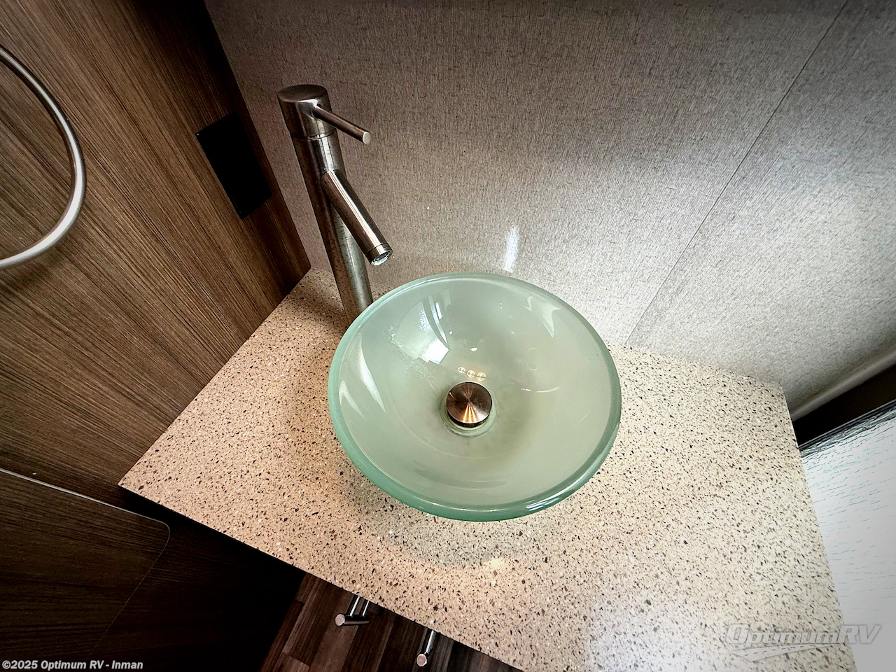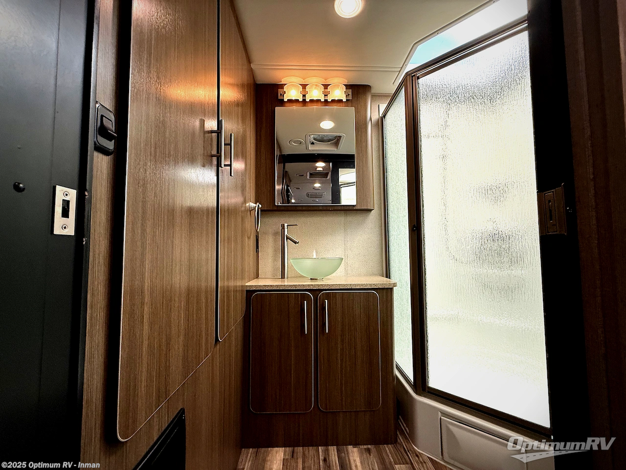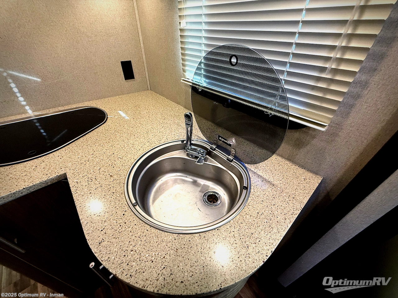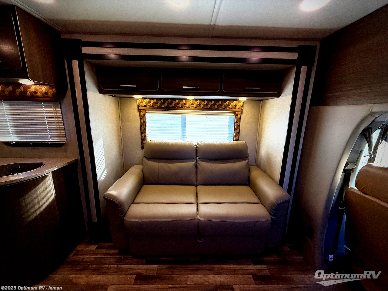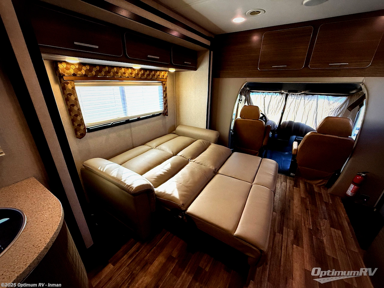 Step inside and find a kitchen area to the left of the door. There is a round sink, two burner cook-top, and 7 cu. ft. refrigerator with microwave oven. You will also enjoy storage with upper and lower cabinet space for your things. There is a 26" LED TV mounted above the sink for your enjoyment.