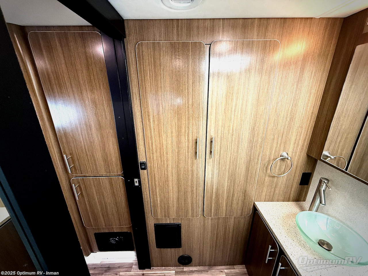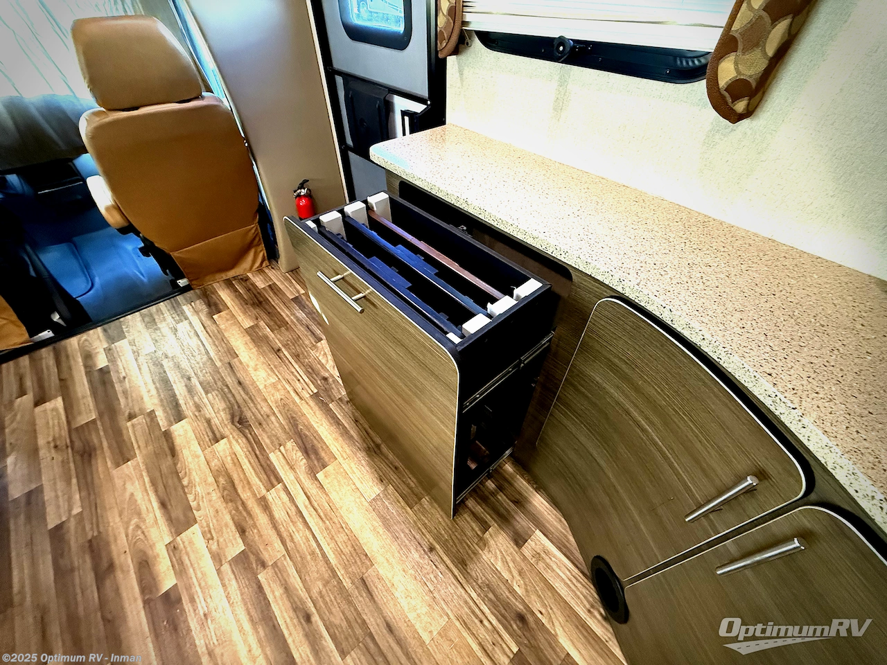 Directly across from the kitchen is a jackknife sofa with overhead cabinet slide out. You can choose a hide-a-bed sofa option instead. The slides also features a pantry for food storage, and a wardrobe for your clothing.