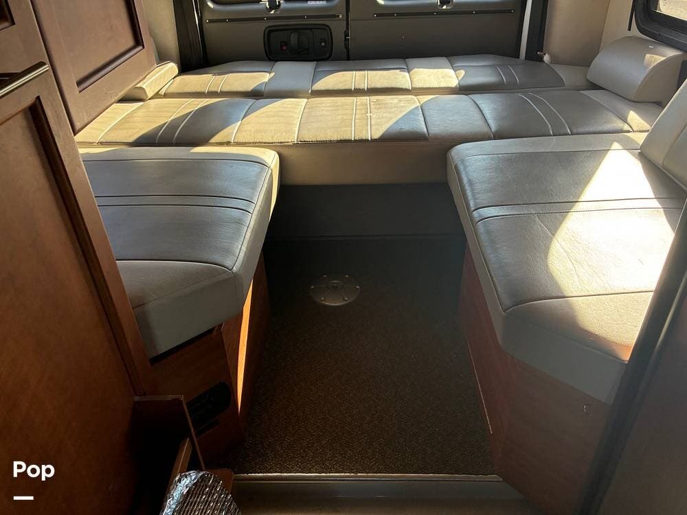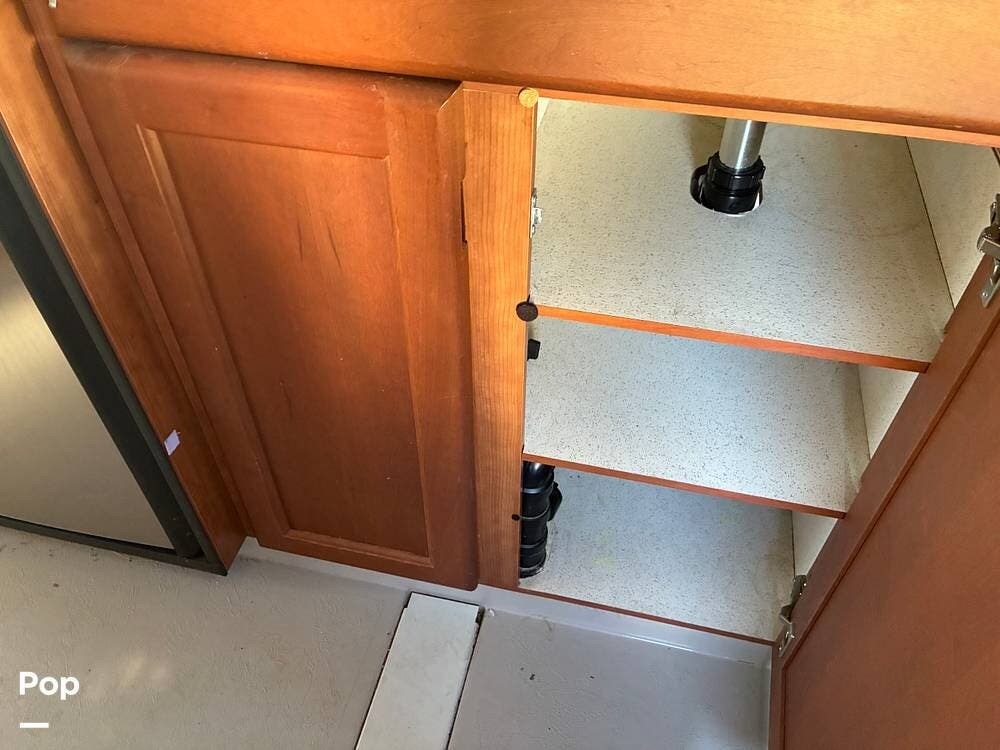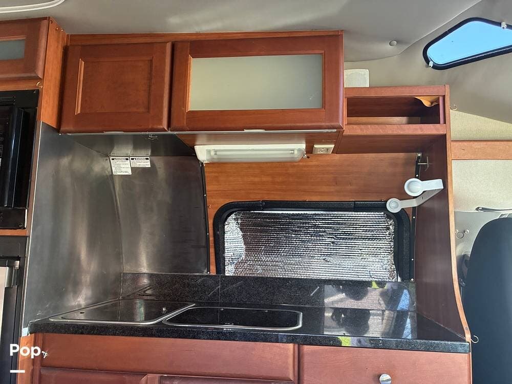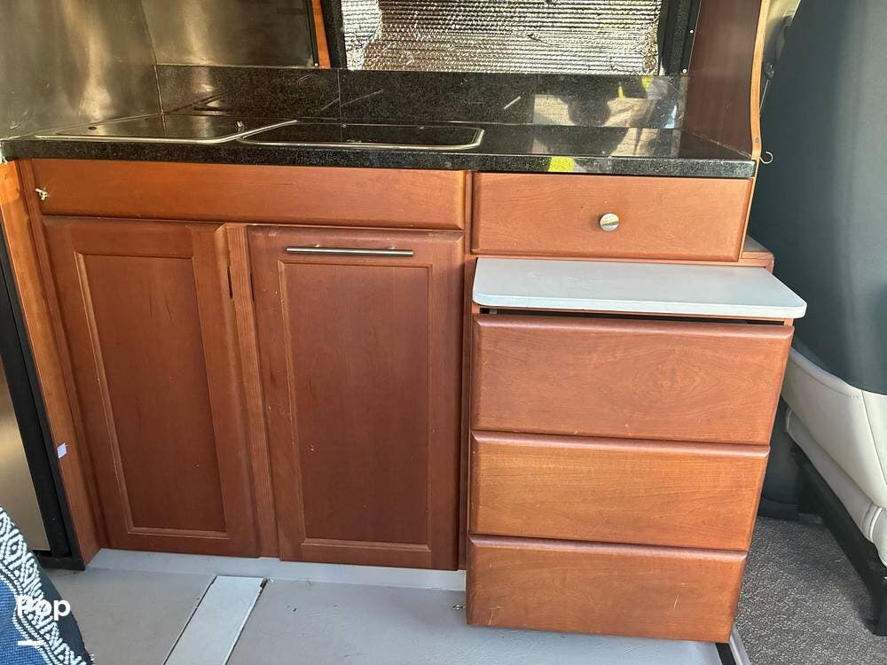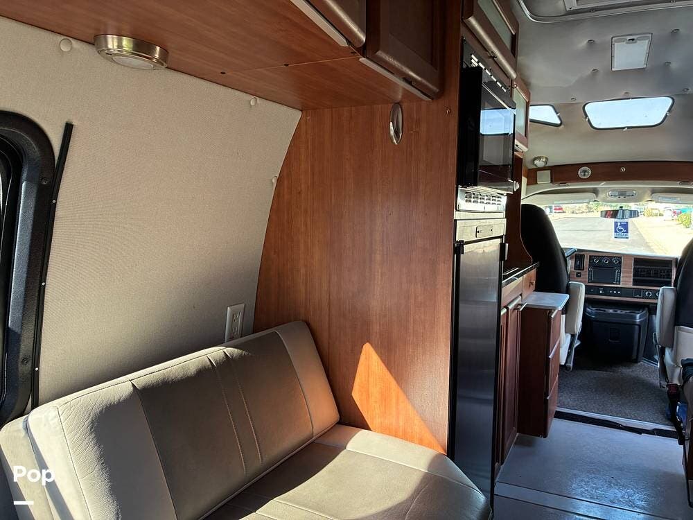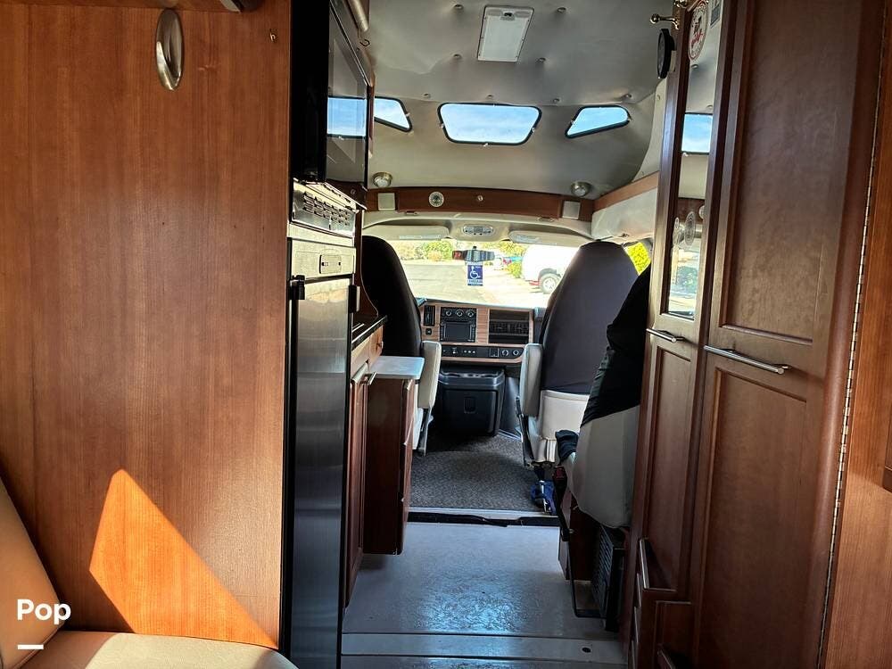 Inside, the galley area includes a refrigerator, microwave, cooktop, and sink, along with overhead cabinetry and storage distributed throughout the coach.