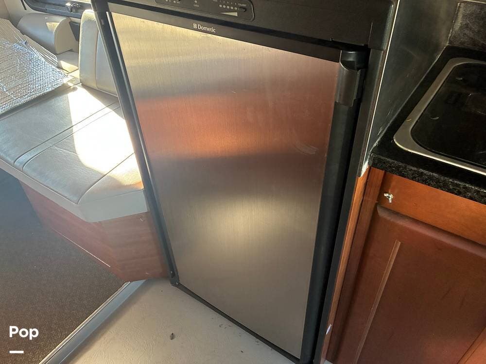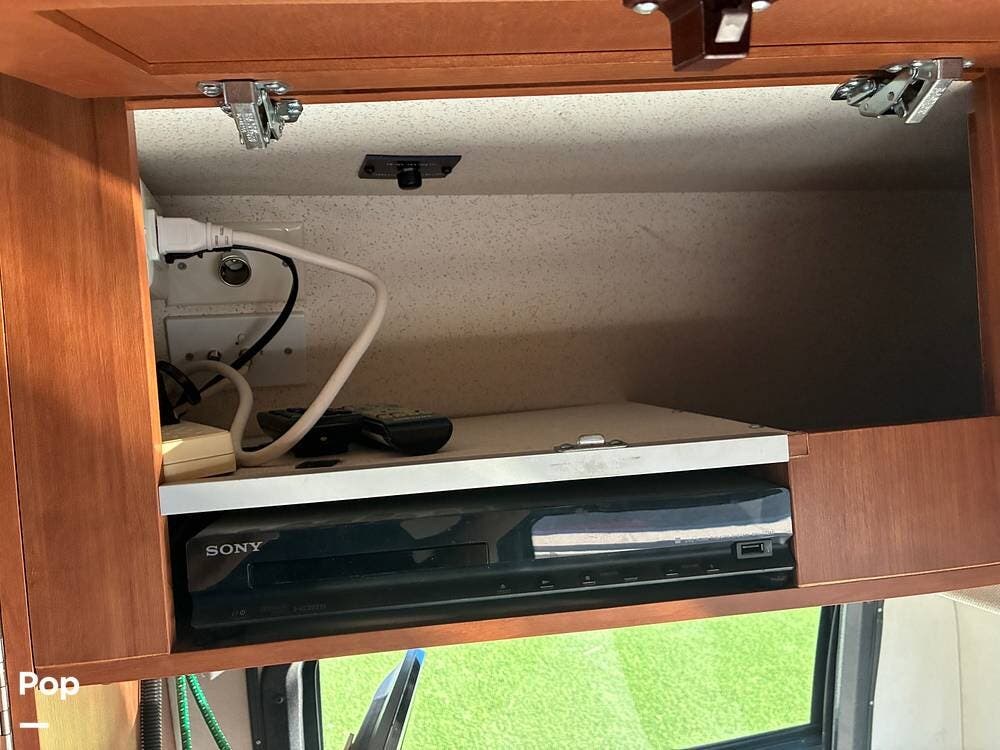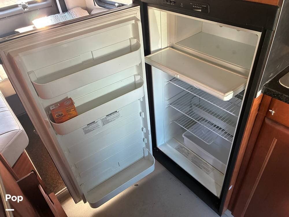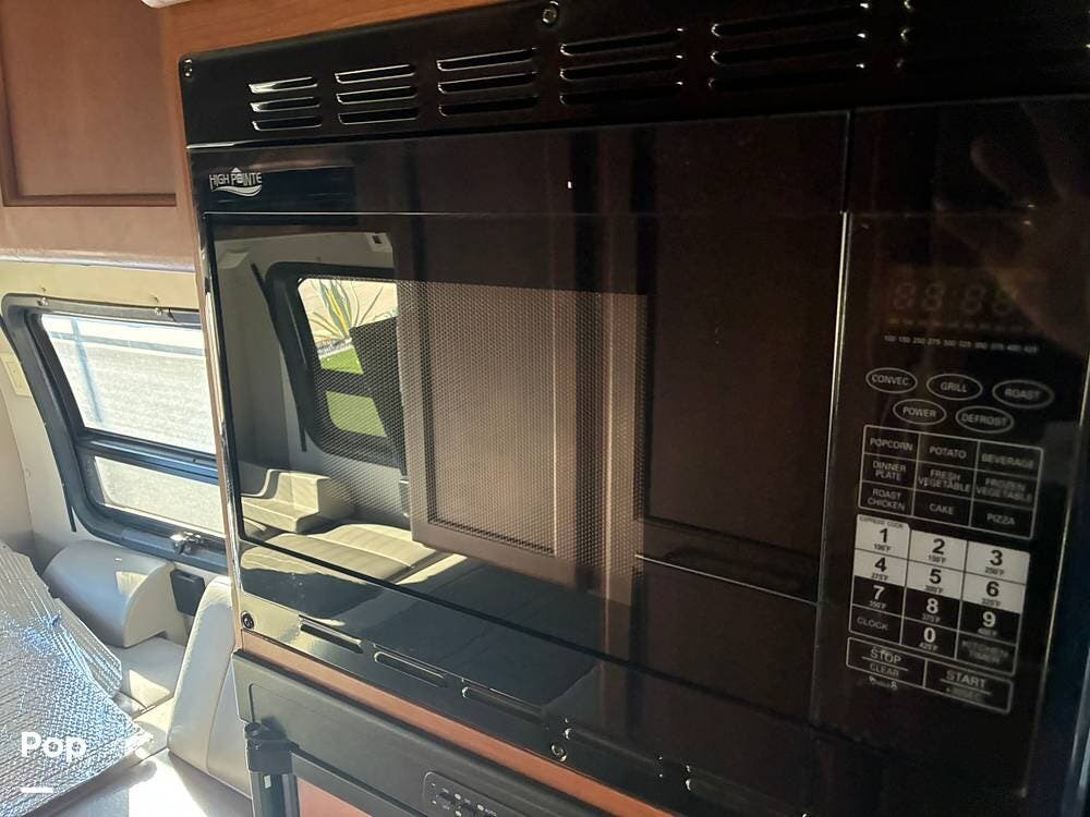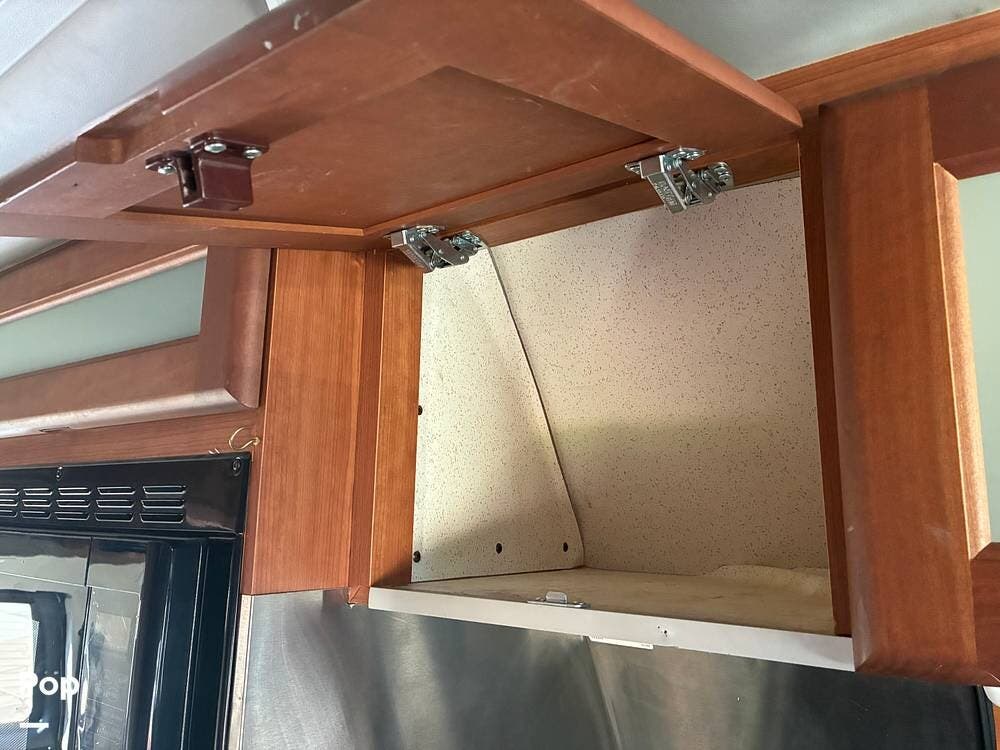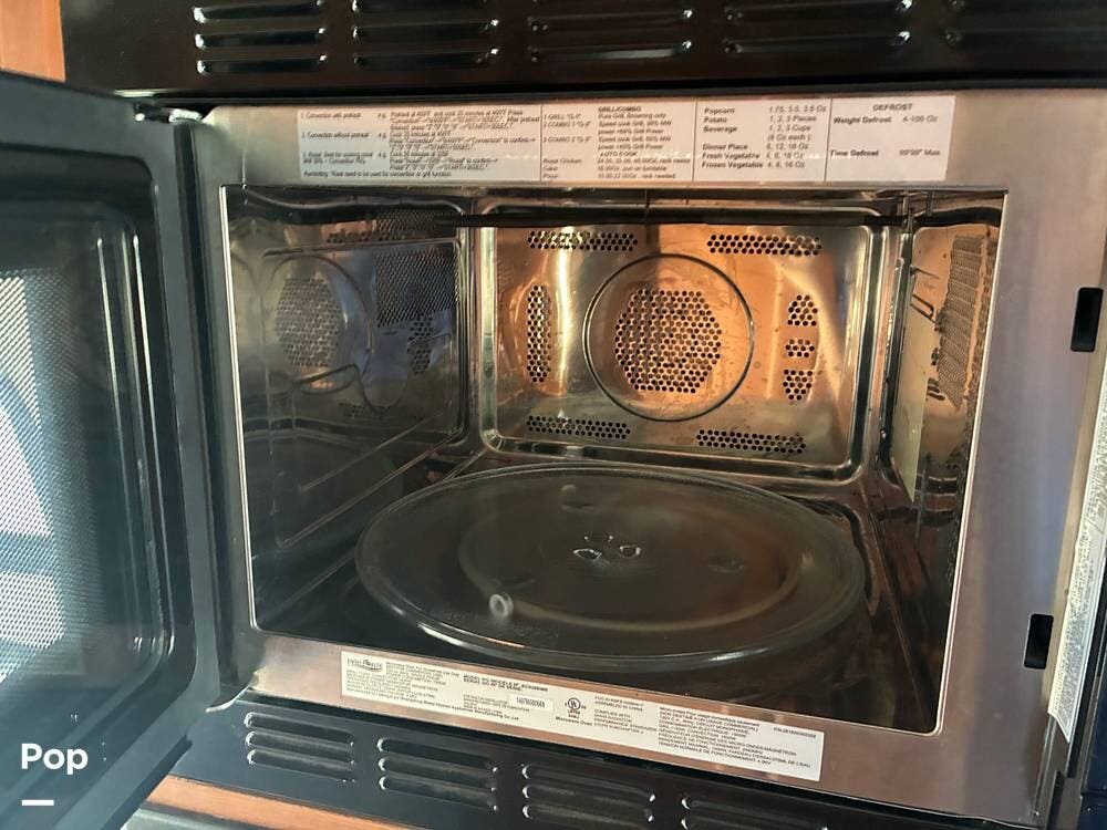 Inside, the galley area includes a refrigerator, microwave, cooktop, and sink, along with overhead cabinetry and storage distributed throughout the coach.