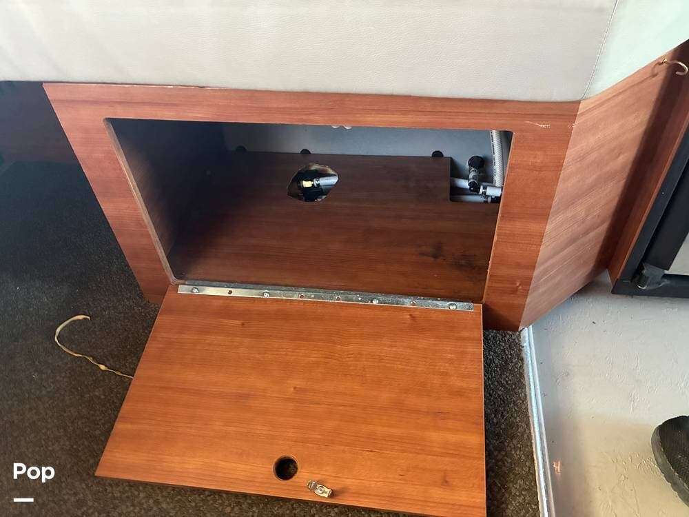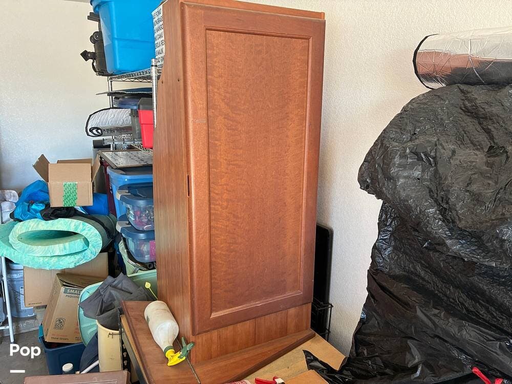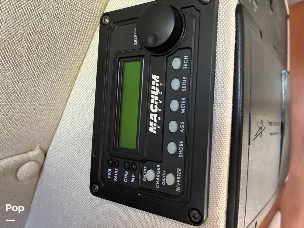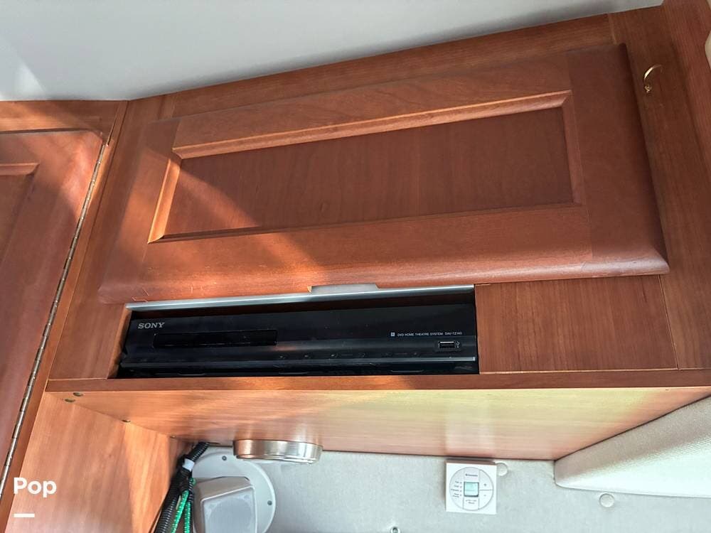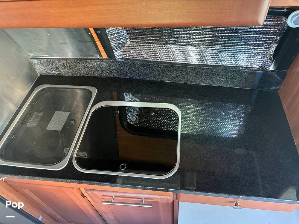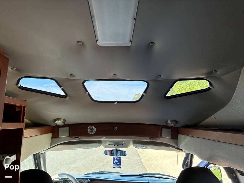 Inside, the galley area includes a refrigerator, microwave, cooktop, and sink, along with overhead cabinetry and storage distributed throughout the coach.