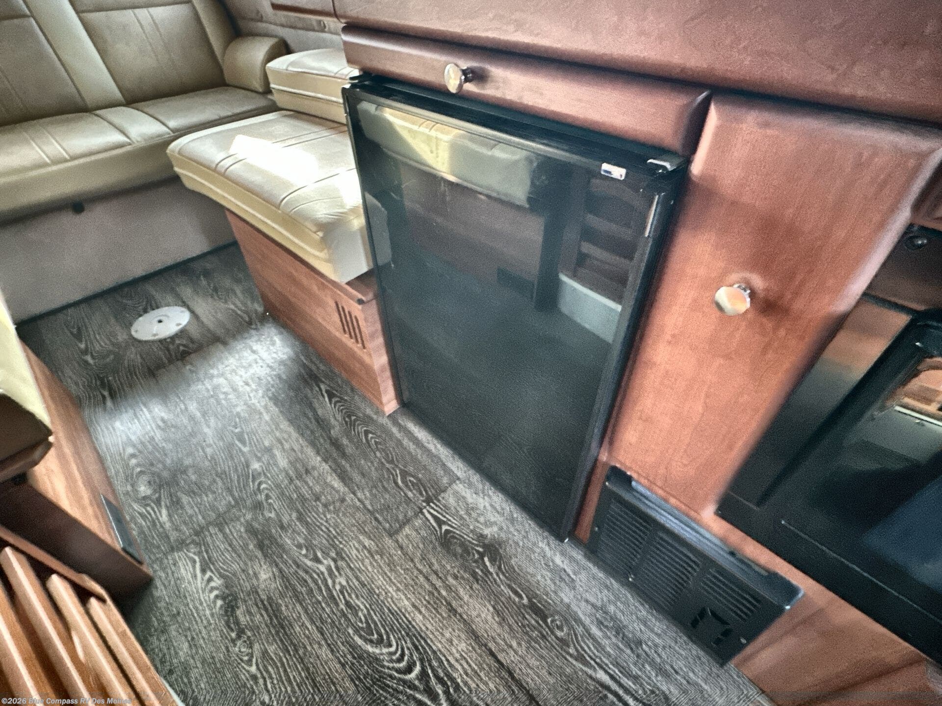 Along the passenger side of the van there is an enclosed toilet and sink. Continuing to the back there is a wardrobe. The driver's side of the coach features a two burner stove top, refrigerator, microwave, and single bowl sink.