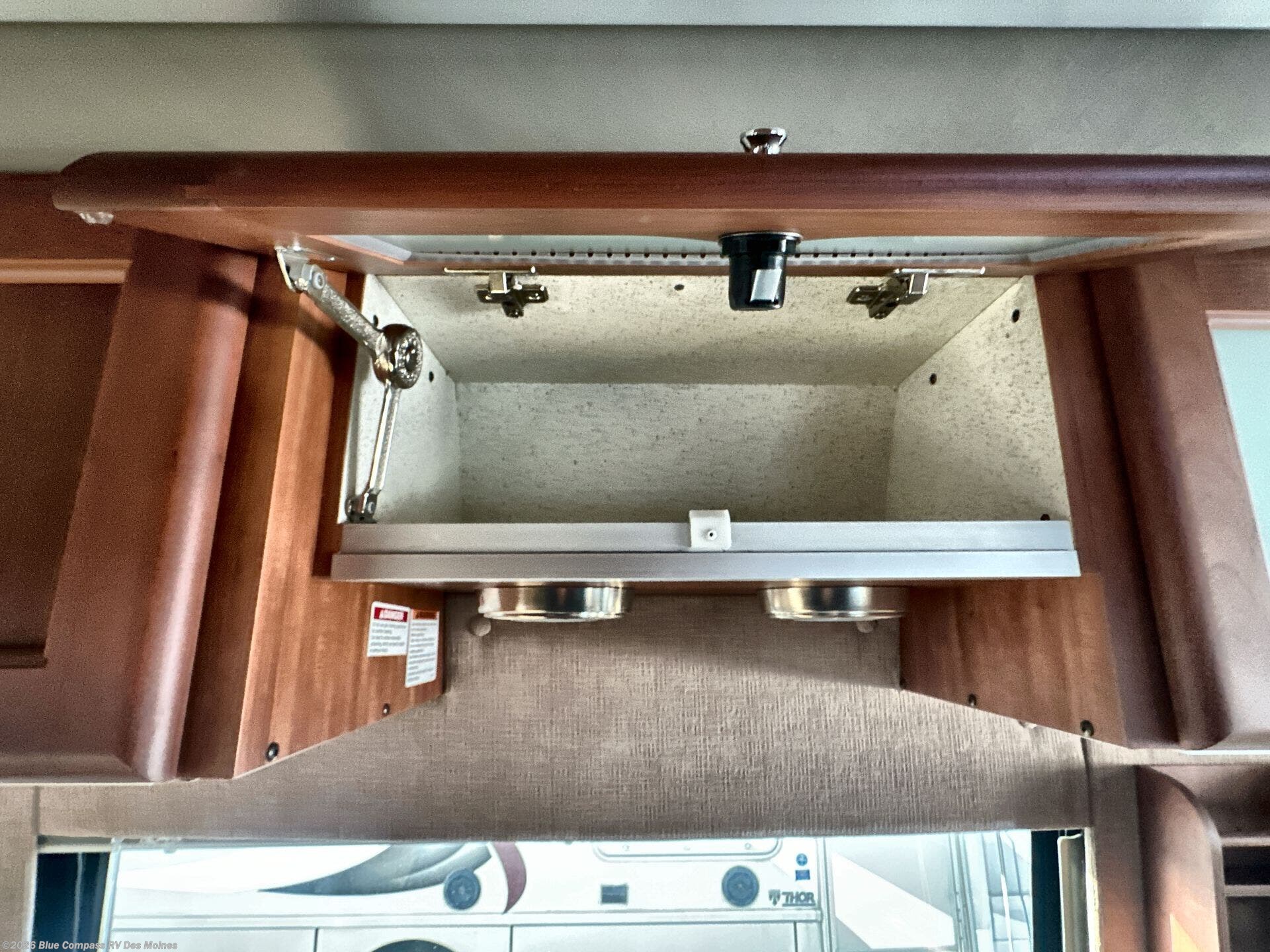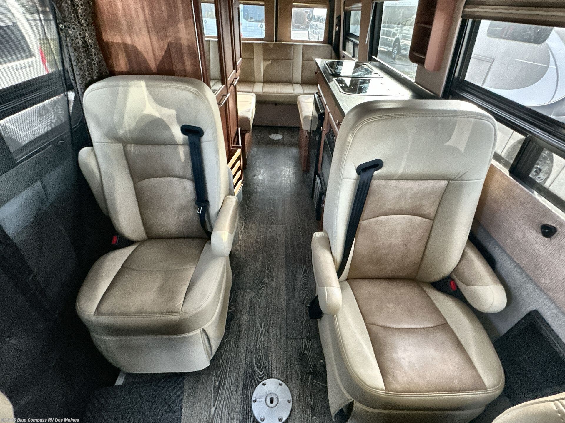 The front of the motorhome includes four captains chairs that swivel to sit around a front pedestal table. Optional folding mattresses can be added to the chairs on either or both sides to offer additional sleeping space.