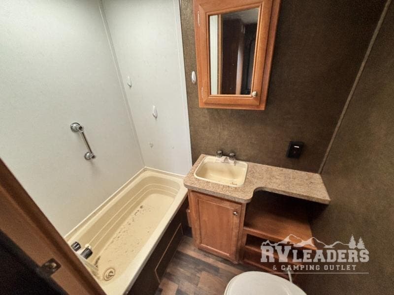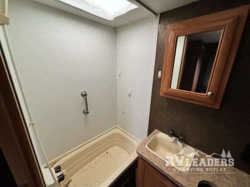 A side bath mid coach offers easy access from the front most outer entry door and features a 36" tub/shower, toilet, and sink with medicine cabinet above.