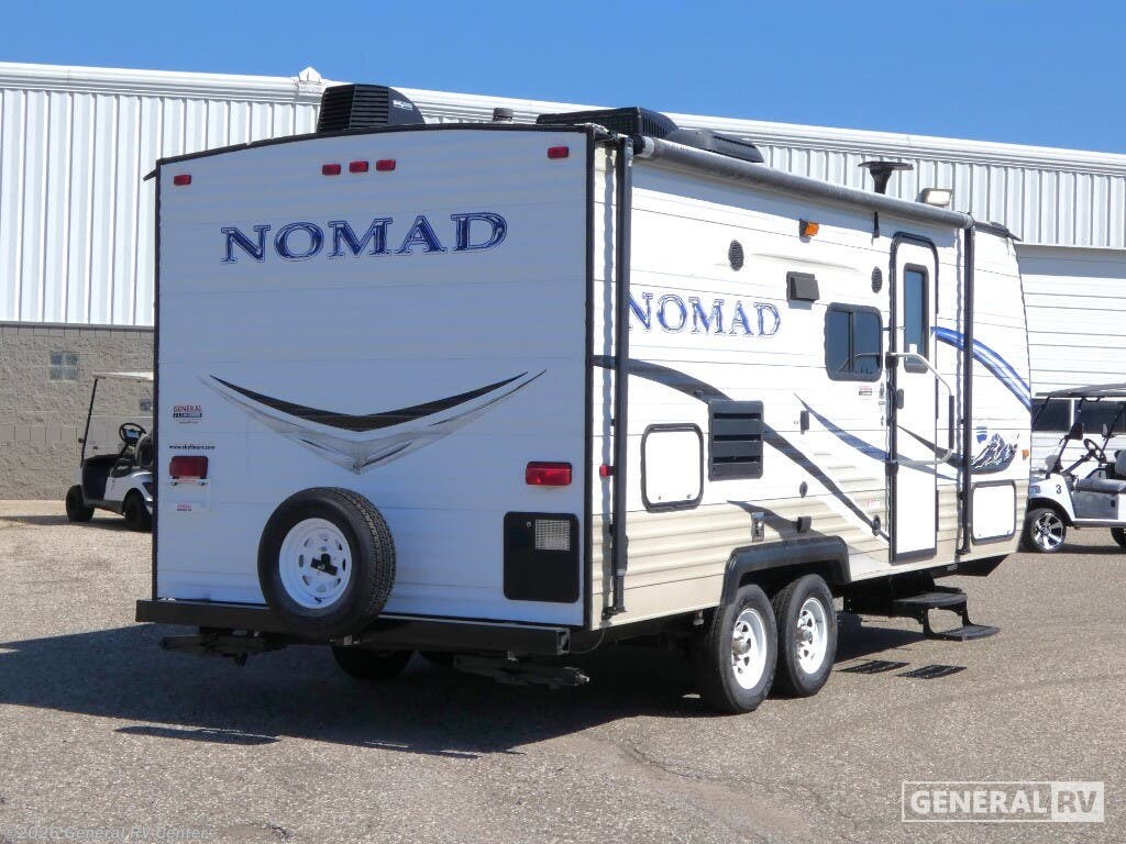 Single Slide Nomad Joey Select Travel Trailer, Rear Wardrobe, Lav., Toilet, Shower, TV Cab, Sofa Bed Slideout w/Free Standing Table, Refrigerator, 2-Burner Range, Double Kitchen Sink, Front Lift-Up Queen Bed, Double Wardrobes, Outside Storage, 12' Awning Much More.