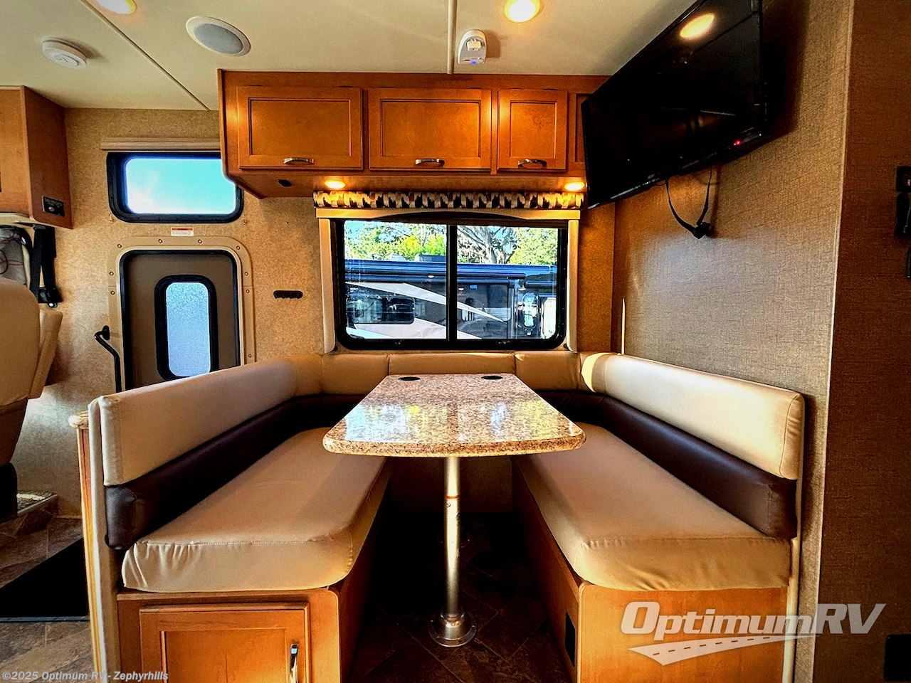 A booth dinette has a 32" LED TV mounted above it, facing the front of the motor home for easy viewing from all seats, including the captain's chairs.