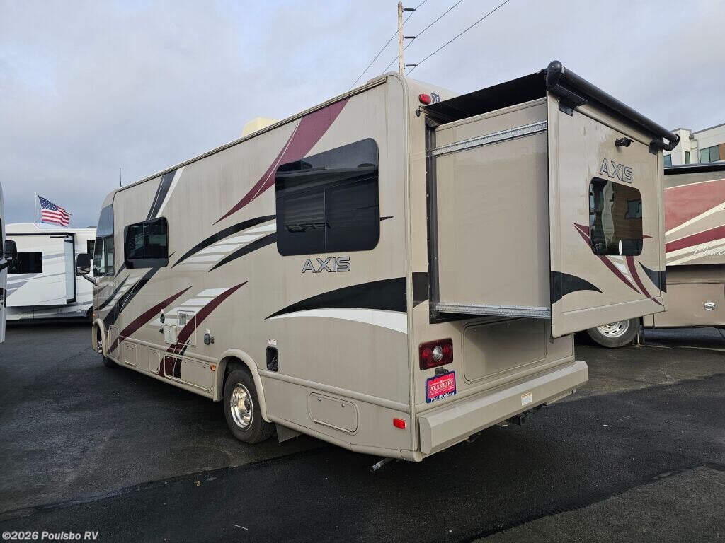 Embrace the joy of RV travel with the 2015 Thor Axis 25.2, a used gas motorhome that blends convenience and comfort for memorable adventures. At 26.6 feet long, this model features a well-designed floorplan ideal for family trips or group getaways. A single slide out expands the living space, providing an open and airy environment that invites relaxation after a day on the road. The interior comfortably sleeps up to five, making it perfect for families or small groups seeking flexibility and ease. The living area is crafted to accommodate socializing and unwinding, with seating arrangements that foster connection and comfort. For added enjoyment, an awning extends your living space outdoors, offering shade for dining or lounging amid nature. Stabilizing leveling jacks ensure your RV remains steady on varying campsite surfaces, enhancing safety and convenience. The Axis 25.2 is equipped with thoughtful features that enrich the RV lifestyle, balancing practicality with comfort so you can focus on creating lasting memories. Whether you want to explore new destinations or simply enjoy a weekend escape, this motorhome provides the space and versatility you need. As a family-owned, award-winning local RV dealer with multiple locations in Sumner, Everett, Kent, and Mt. Vernon Washington, Poulsbo RV is here to help you find the perfect RV. Stock#: CC5345, VIN: 1FC3E3KS1FDA11427.