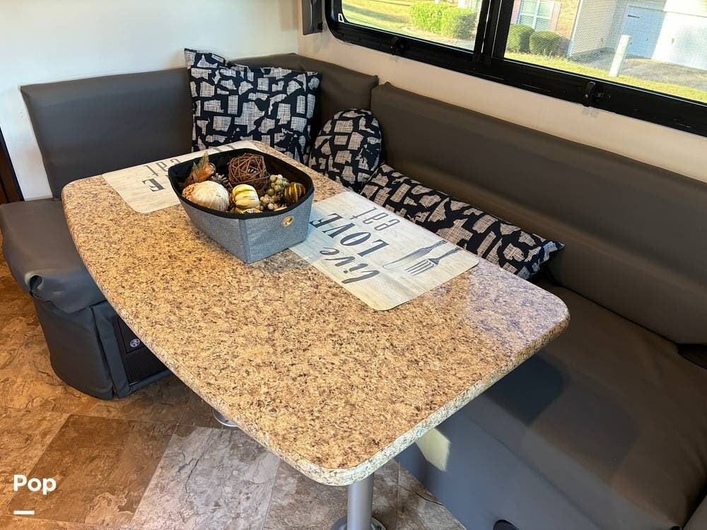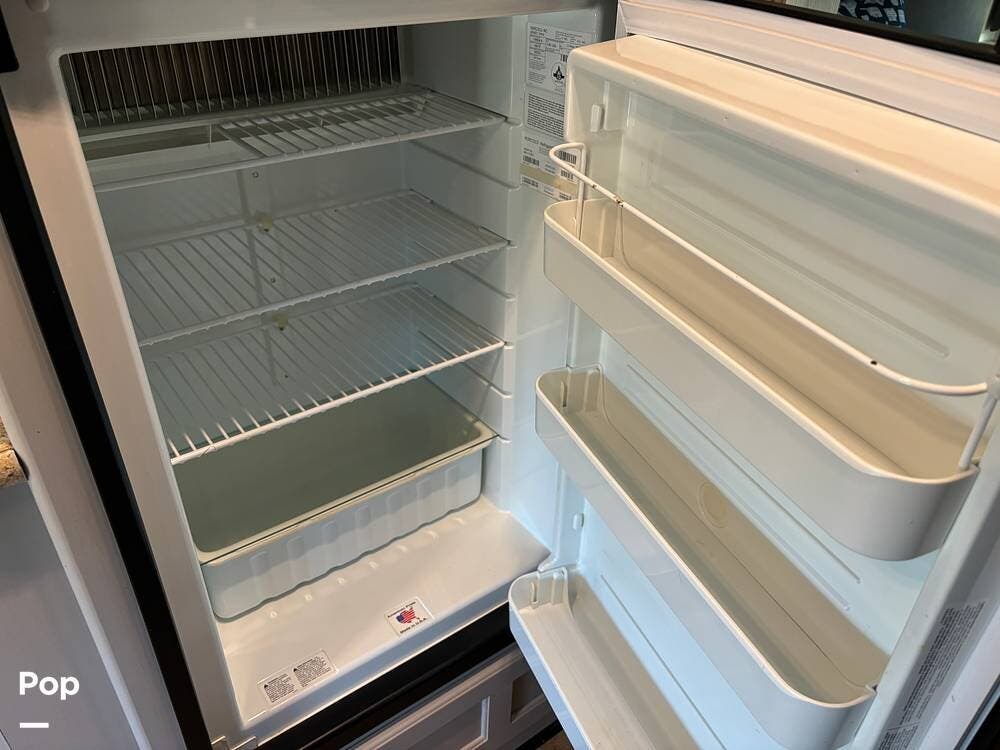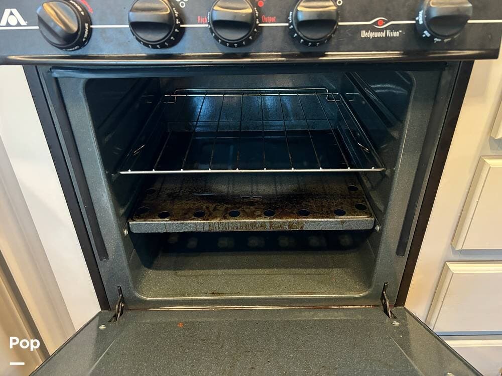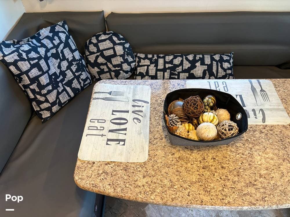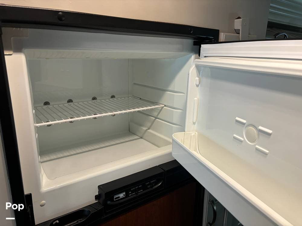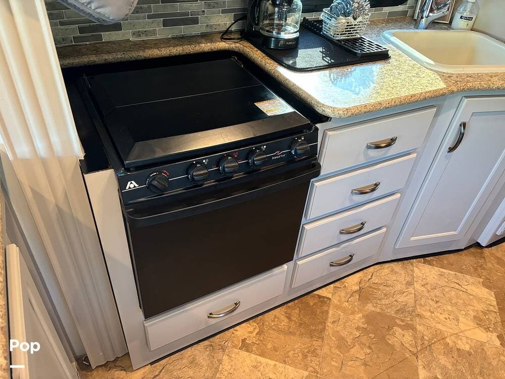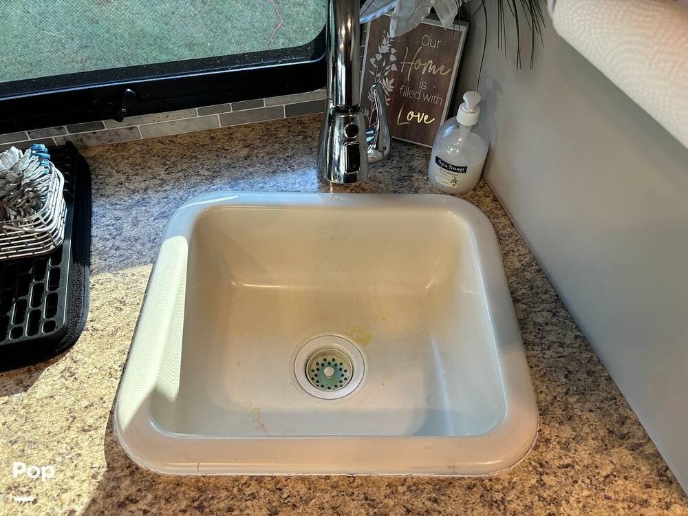 The kitchen has a sink, microwave, oven, and a standard RV refrigerator/freezer. Across from the kitchen is the dinette, which can be converted into a sleeping area if needed.