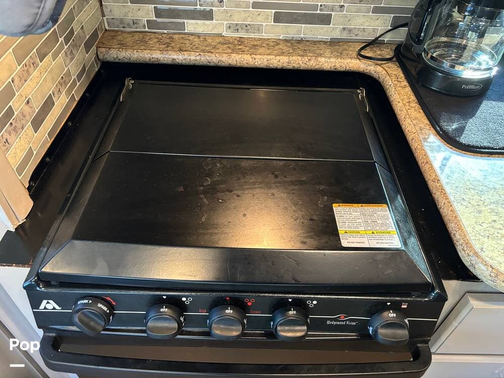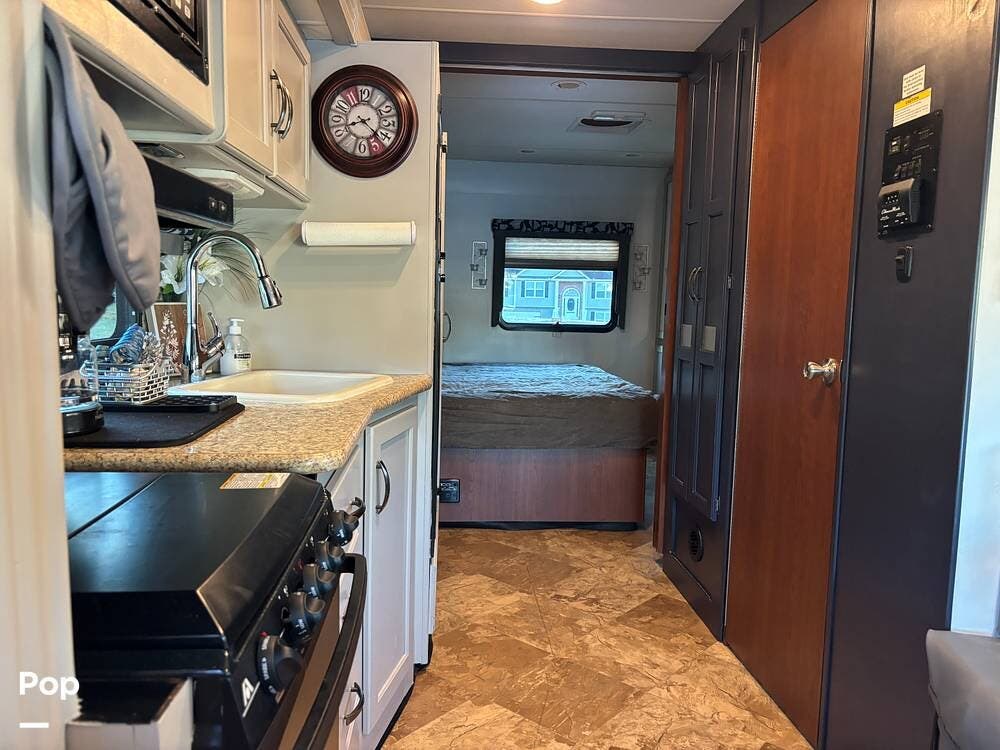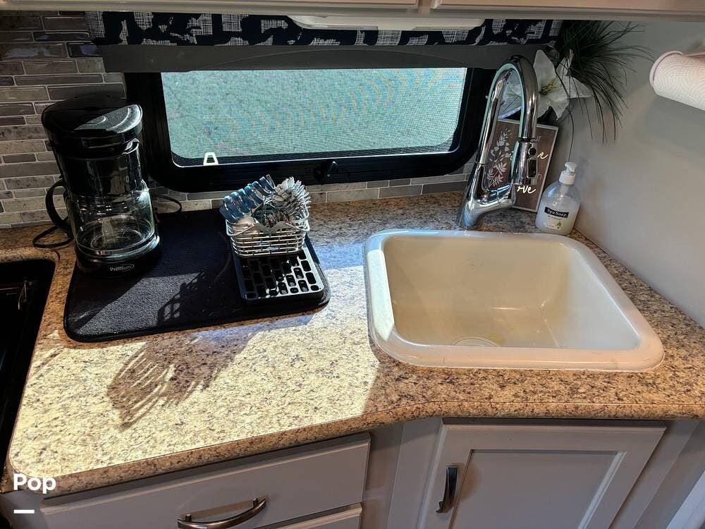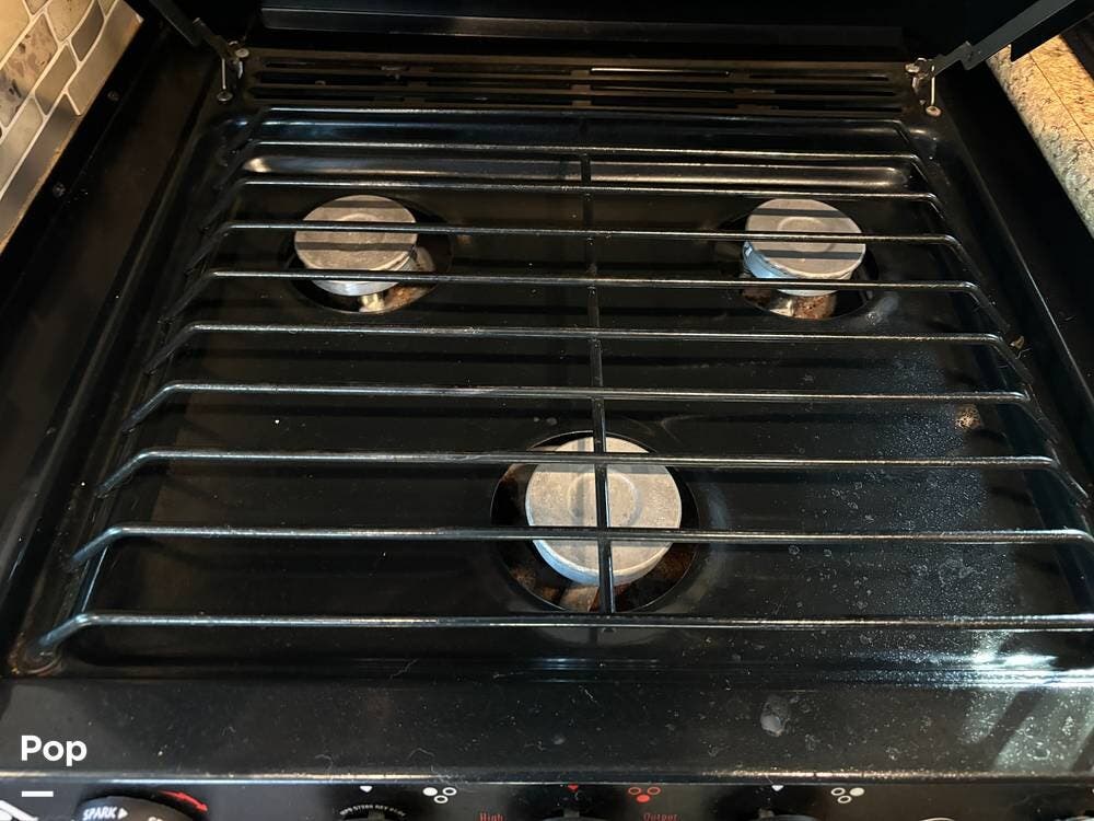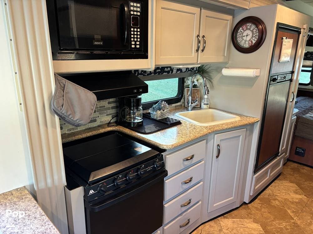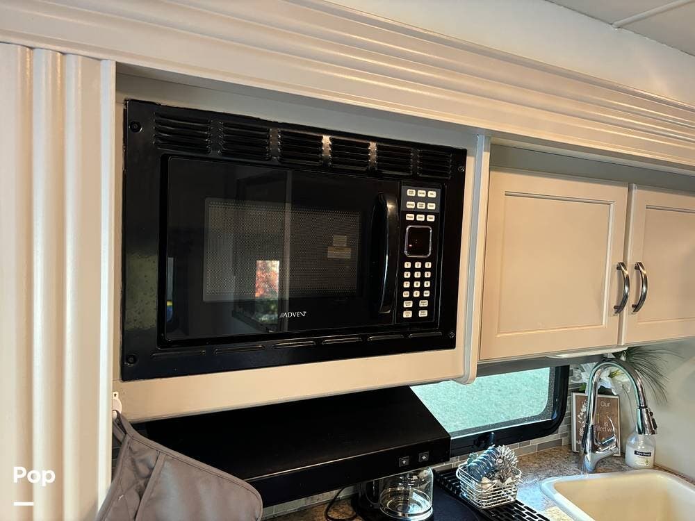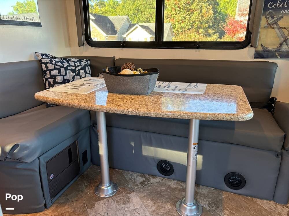 The kitchen has a sink, microwave, oven, and a standard RV refrigerator/freezer. Across from the kitchen is the dinette, which can be converted into a sleeping area if needed.