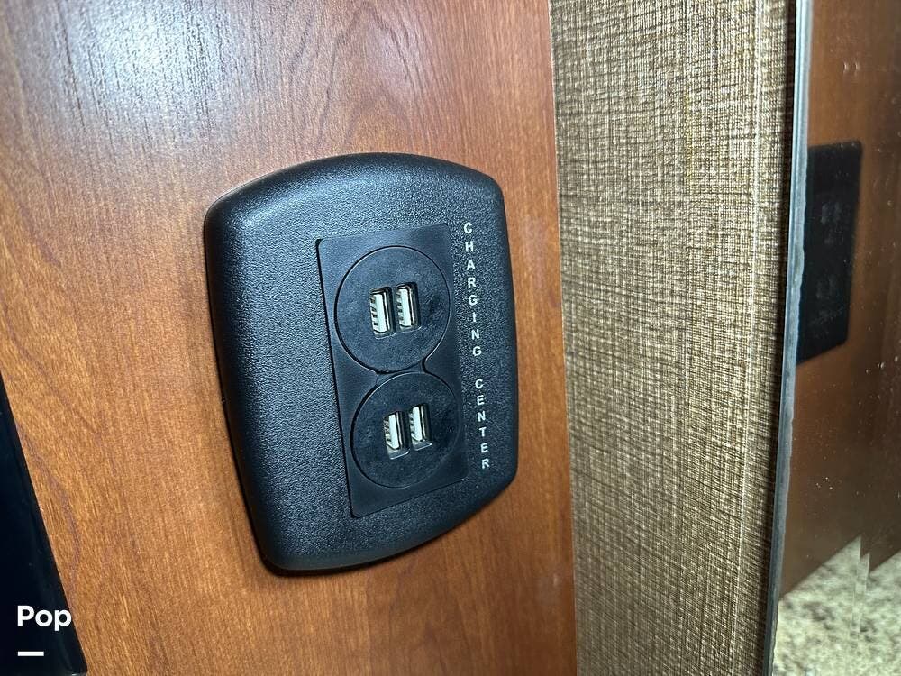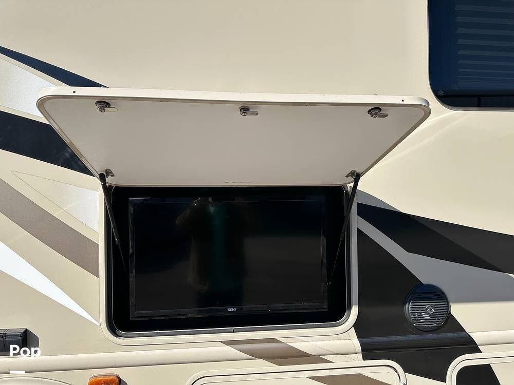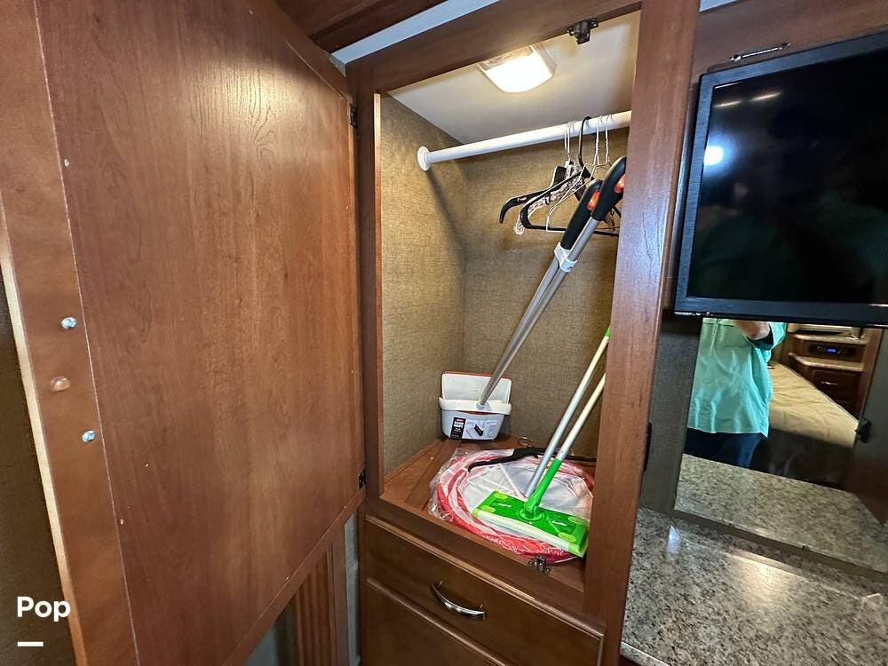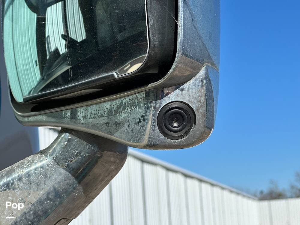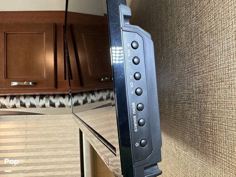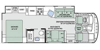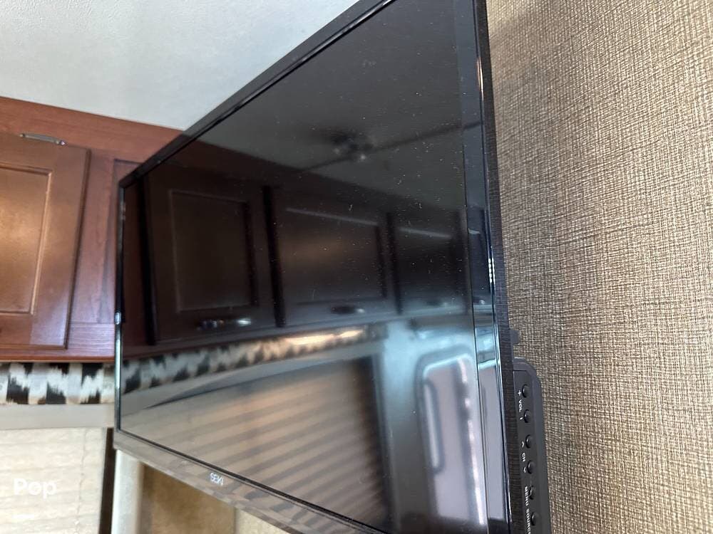 The rear features a queen bed with closets on either side and a 24" LED TV in the corner of the room. The electronic drop-down overhead bunk above the cab area offers additional sleeping space. The unit comes with backup and side cameras.