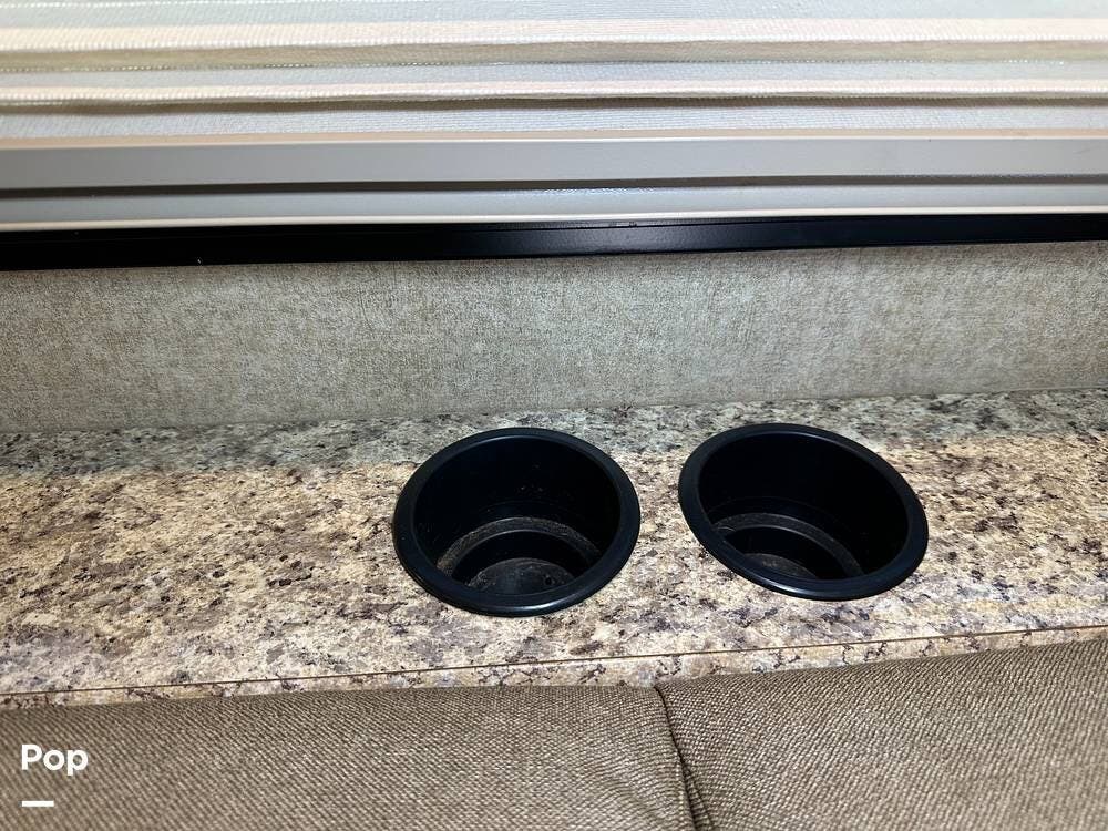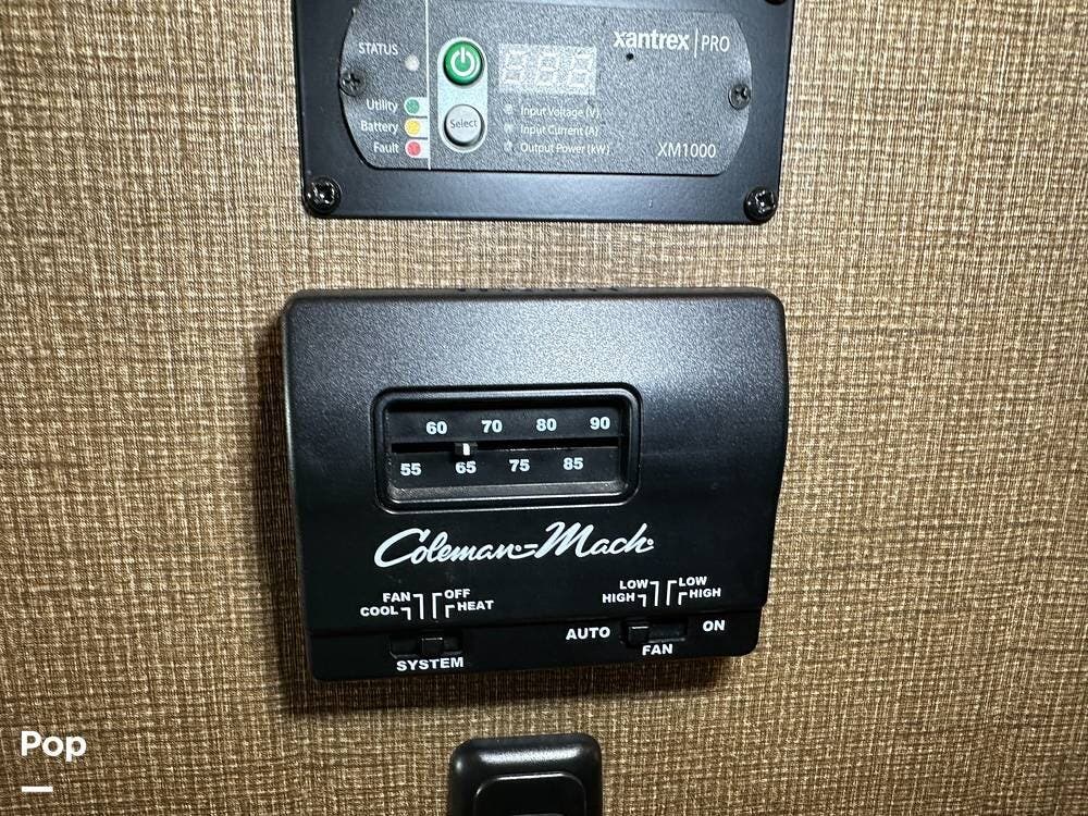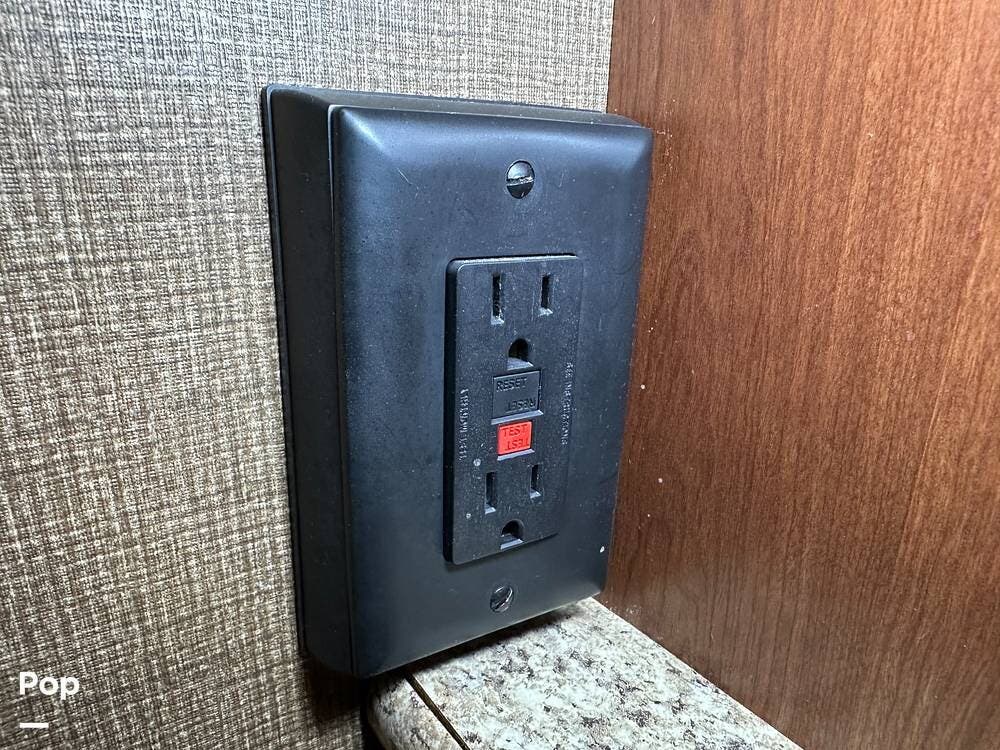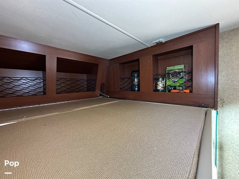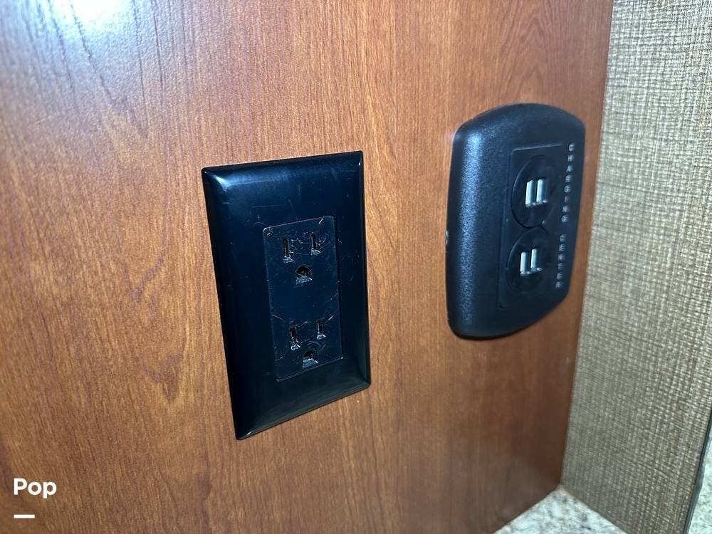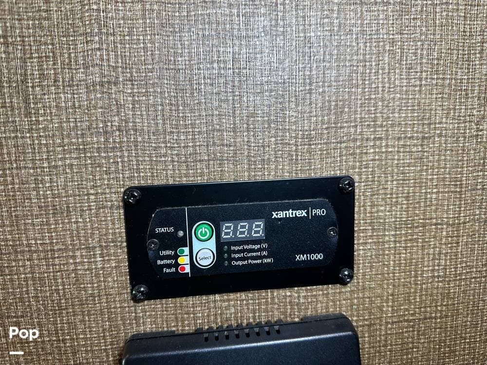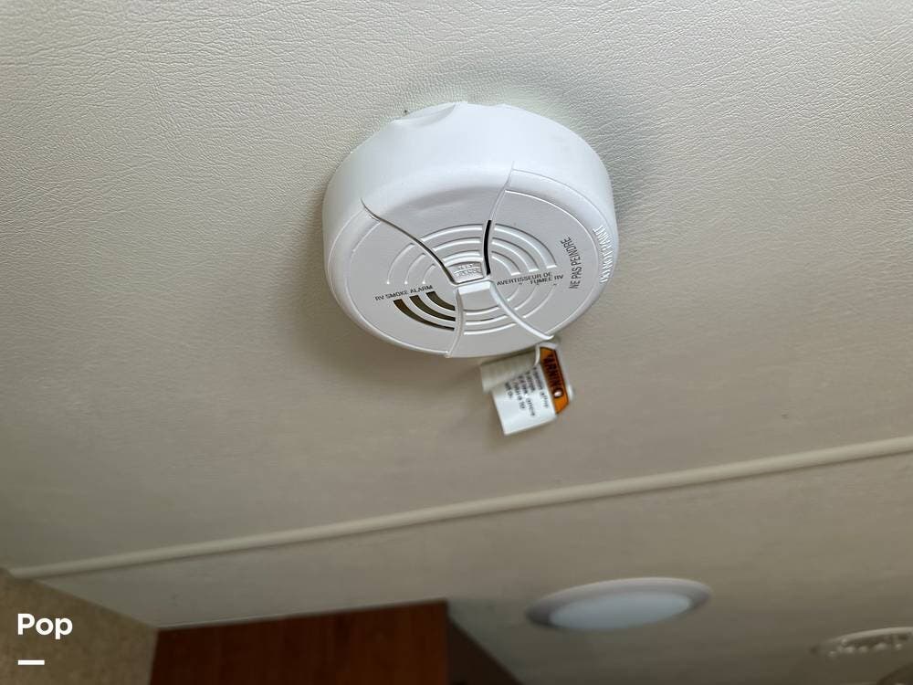 The rear features a queen bed with closets on either side and a 24" LED TV in the corner of the room. The electronic drop-down overhead bunk above the cab area offers additional sleeping space. The unit comes with backup and side cameras.