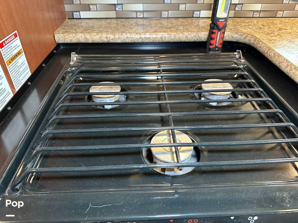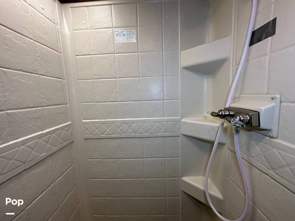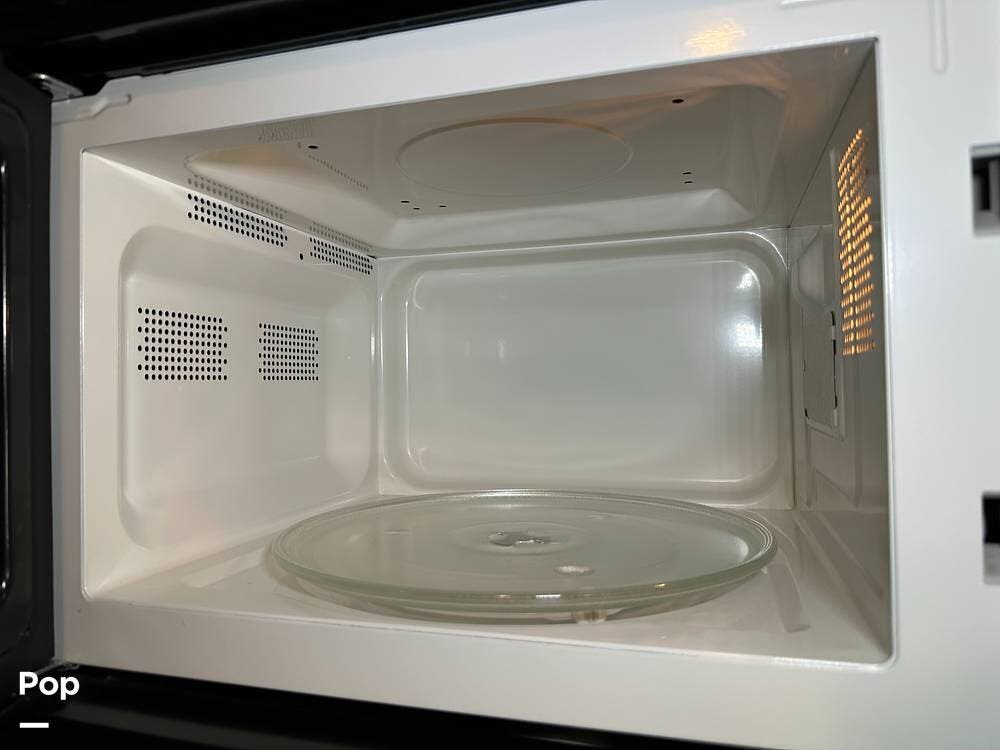 There is also a three-burner range, oven with an overhead microwave oven, and refrigerator for all your food prep and cooking needs. Opposite the kitchen area is a complete bath with a toilet, sink, and shower. There is also a linen cabinet for your towels and toiletries.