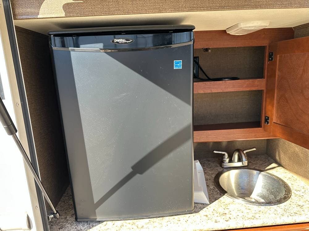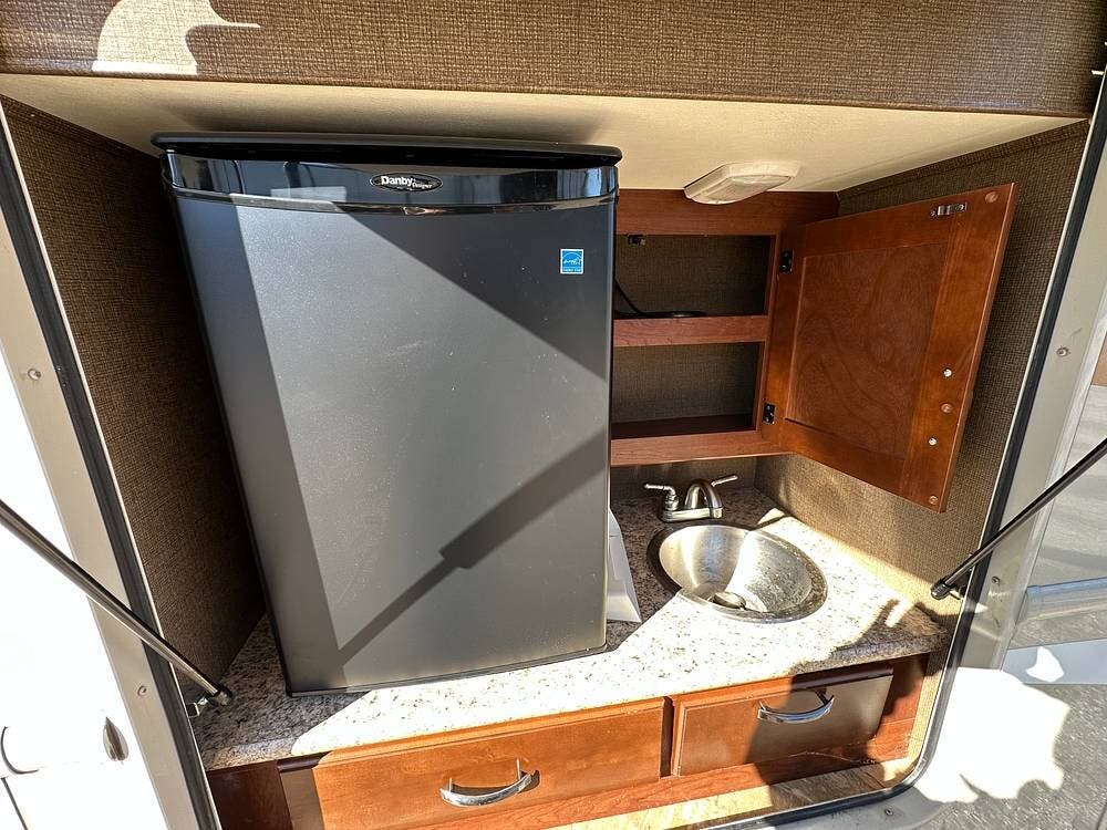 Outside is a TV, stereo speakers, and a large awning. It also has an exterior kitchen with a 2.6 cu. ft. refrigerator, sink, & 1000-watt Inverter