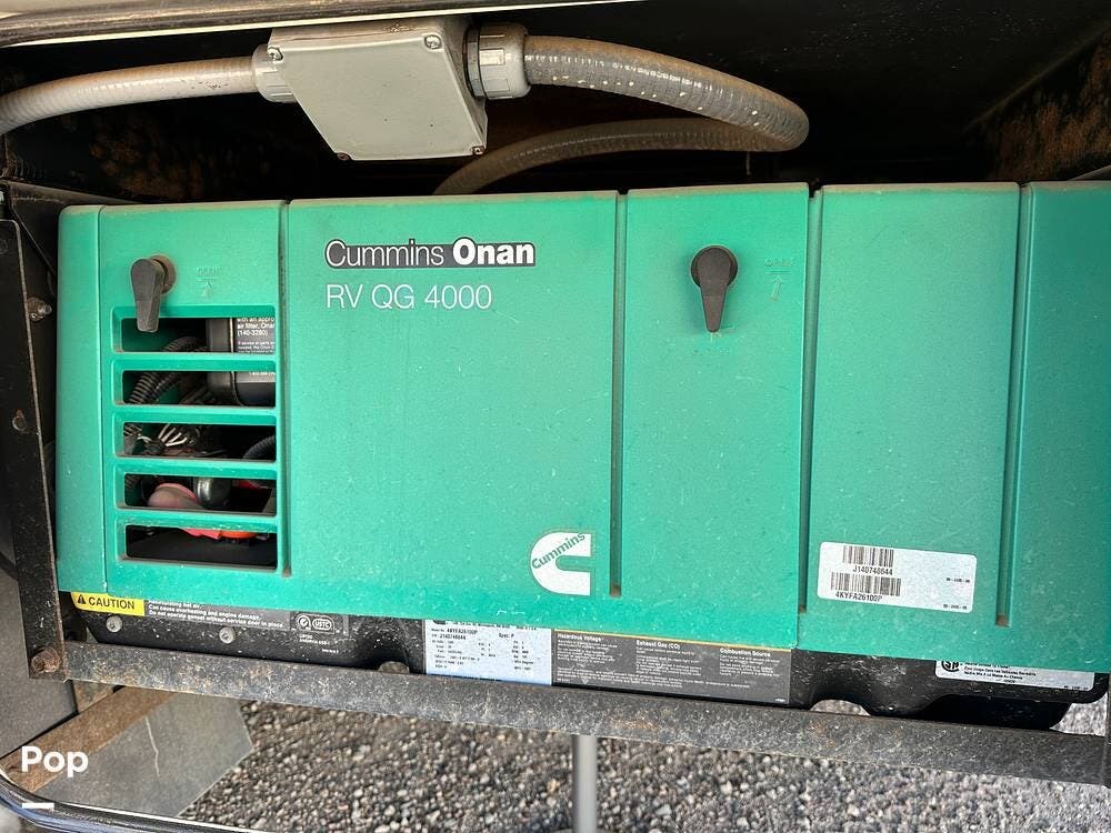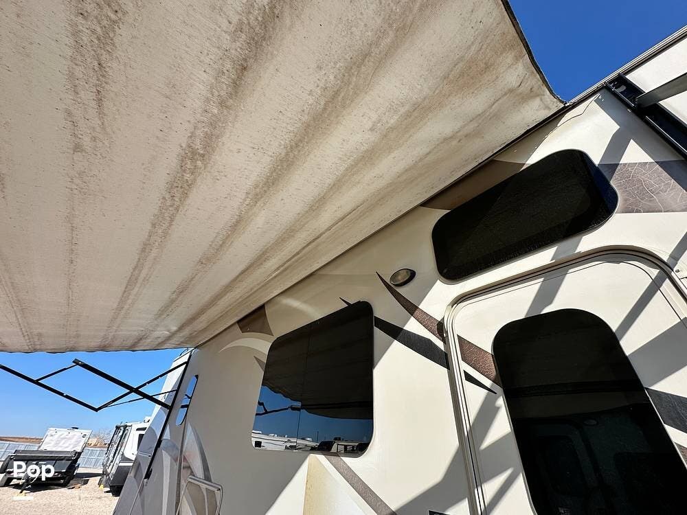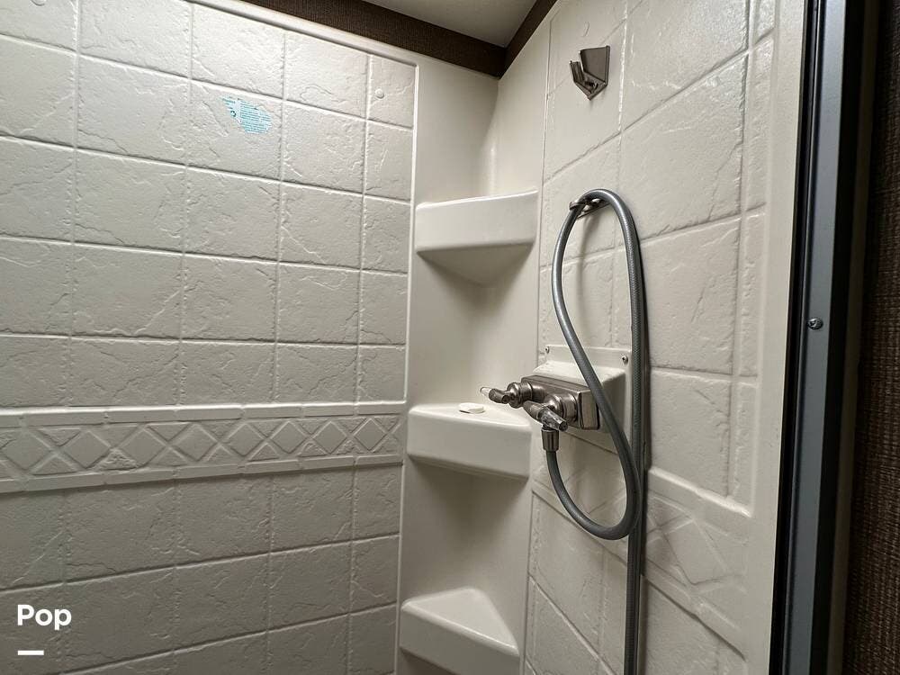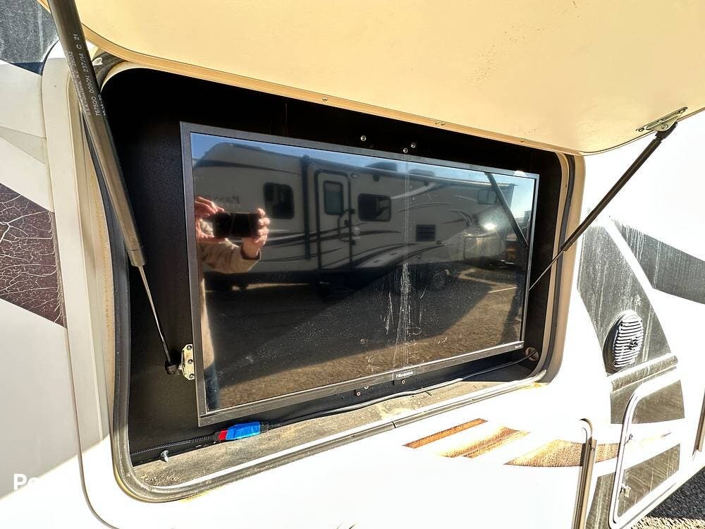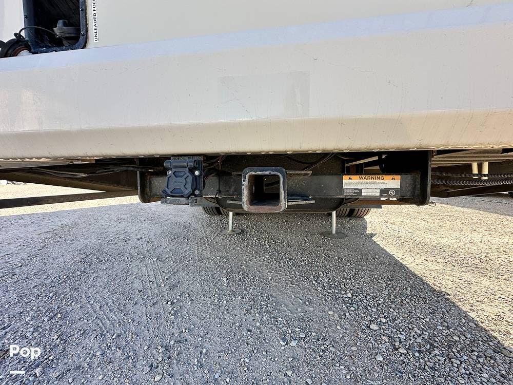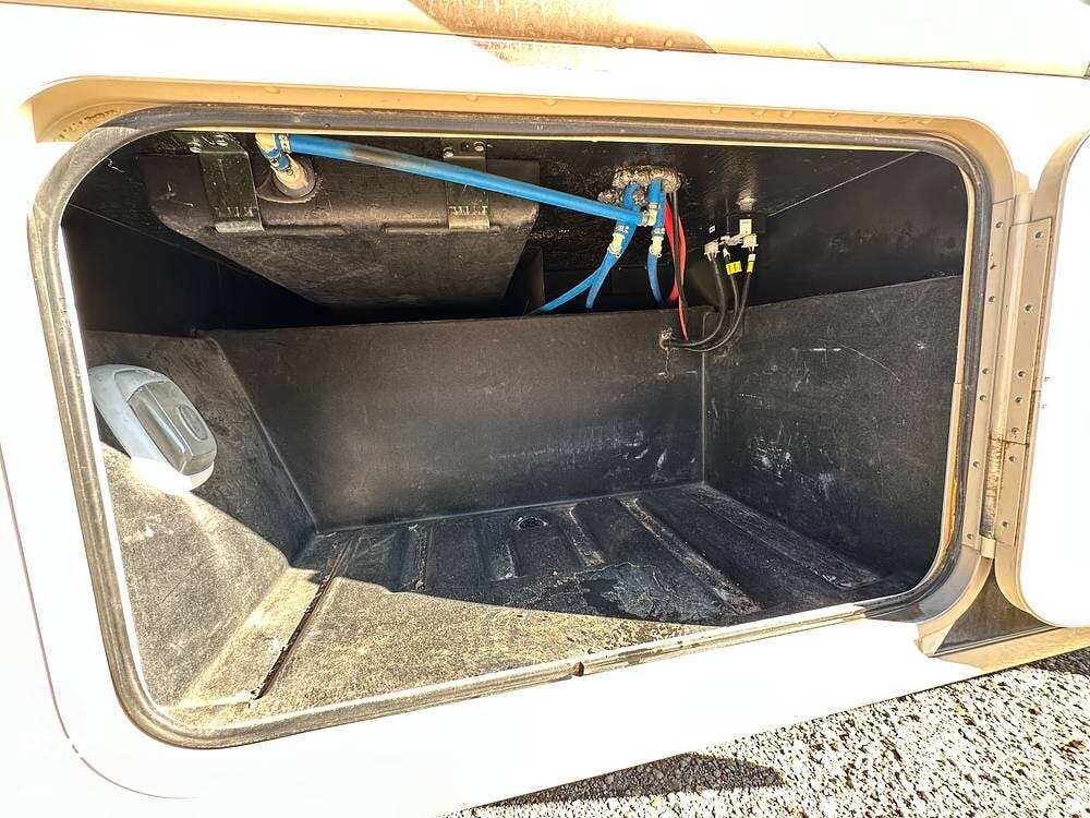 The exterior features are many and include a 4.0kW generator with 90 hours of run time, auto leveling, an outdoor fridge and sink, an outdoor TV, an outdoor shower, and a hitch with an 8,000 lb tow capacity.