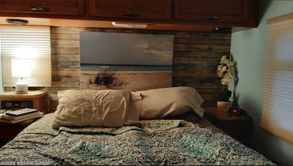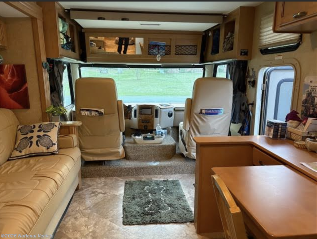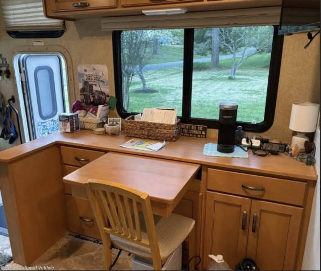 The living space is anchored by a solid wood desk / eat-in table that comfortably seats four, offering versatility for dining, remote work, or entertaining. A dash cover/protector preserves the interior and reduces glare, reflecting the meticulous care this coach has received.
