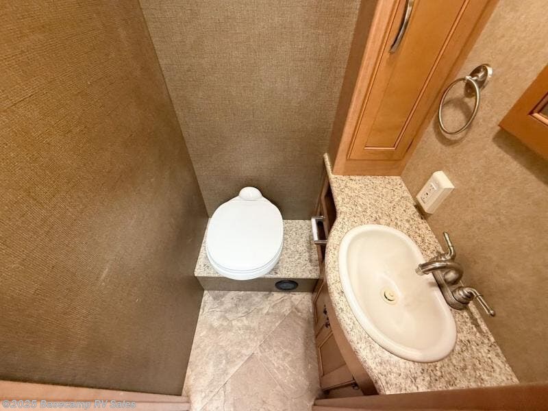 Heading toward the back of the coach you will pass through the bath area with a shower on the left, and private toilet area with vanity sink, overhead cabinets, and linen storage on the right.