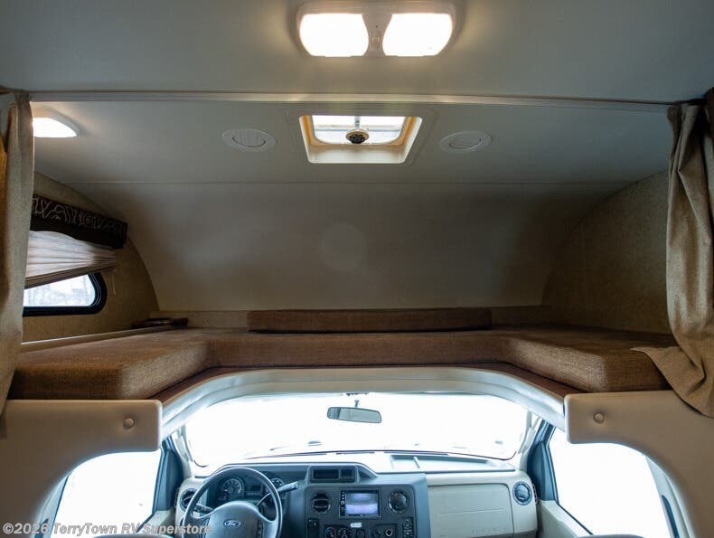 There is a cab over bunk across the front of the Chateau 28Z. Continuing around toward the entry door, there is a jack knife sofa, and overhead cabinets.