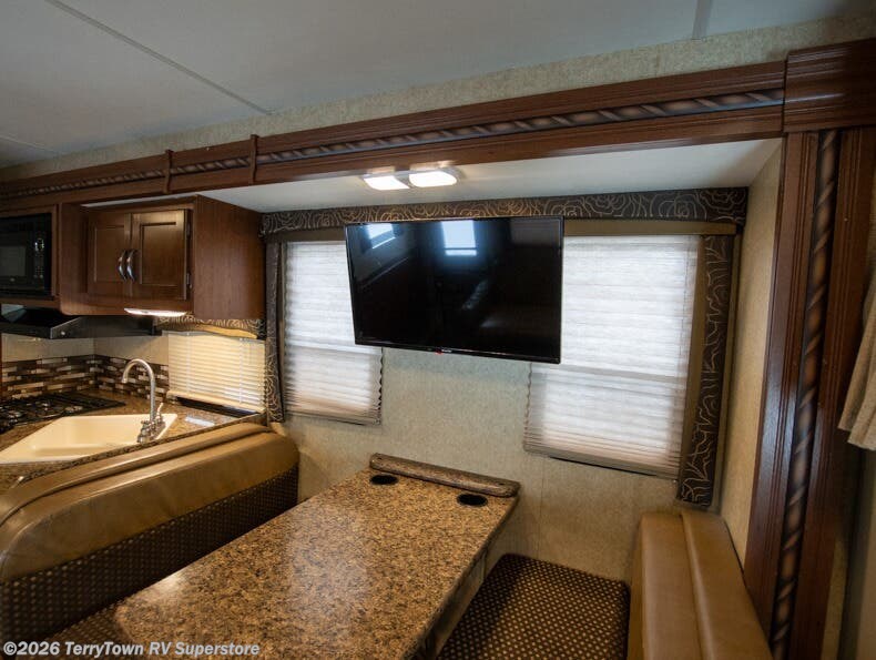 Across, along the driver's side, you will find a refrigerator. Within a slide out, the three burner stove top, overhead microwave, angled large double kitchen sink and overhead cabinets complete the kitchen. A dream dinette with overhead cabinets is also within the slide. Above the dinette you will find a 32" LED TV which can easily be viewed from the main living area.