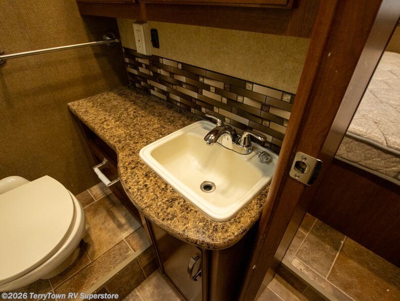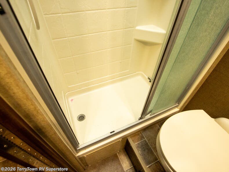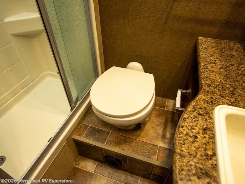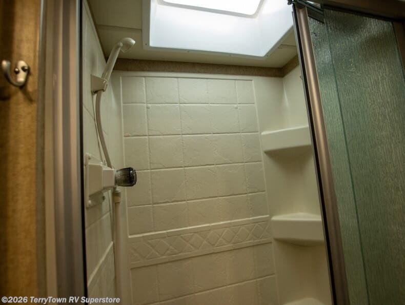 As you move toward the front of this motorhome, there is a side aisle bathroom to your right. It includes a large vanity sink, overhead cabinets, toilet and shower.