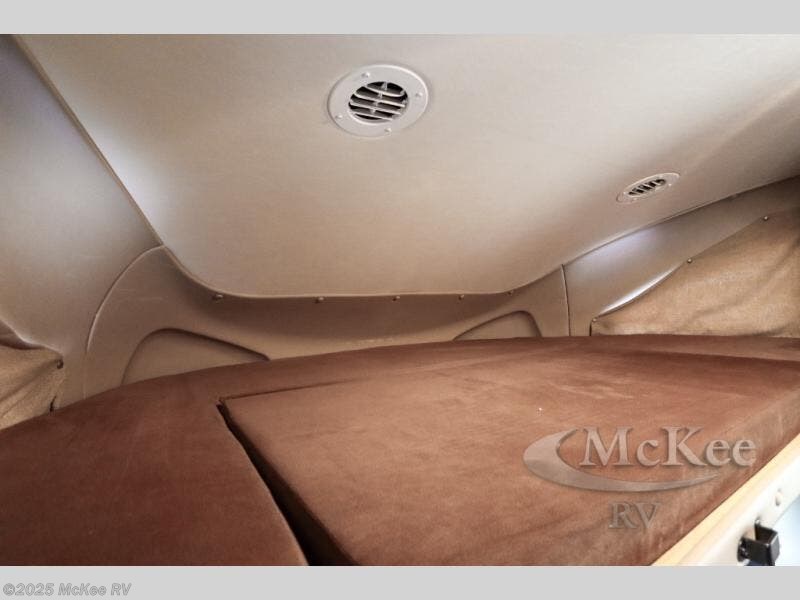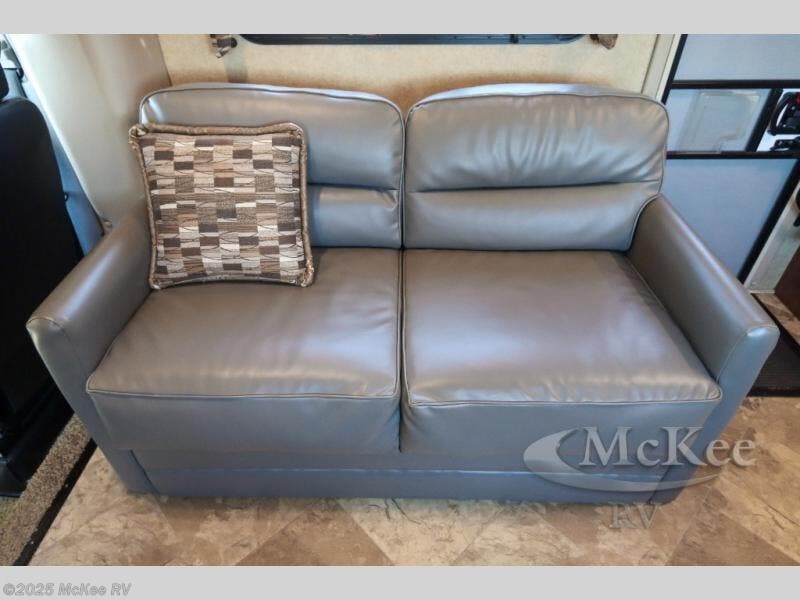 As you step inside to the right is a 54" by 74" sofa that doubles as a sleeping area, and don't forget the available bunk over the cab.