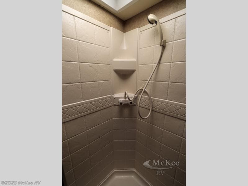 The rear bathroom has a sink with overhead cabinets, angled corner shower, and a toilet.