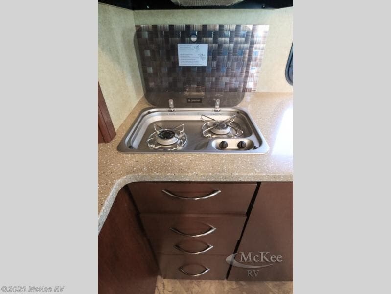 A single large slide out features a L-shaped sofa with a pedestal table, a single round kitchen sink, two burner range top, overhead microwave, and additional counter space. Across from the slide is a 26" TV, a refrigerator, and a large closet to complete the kitchen/living space.