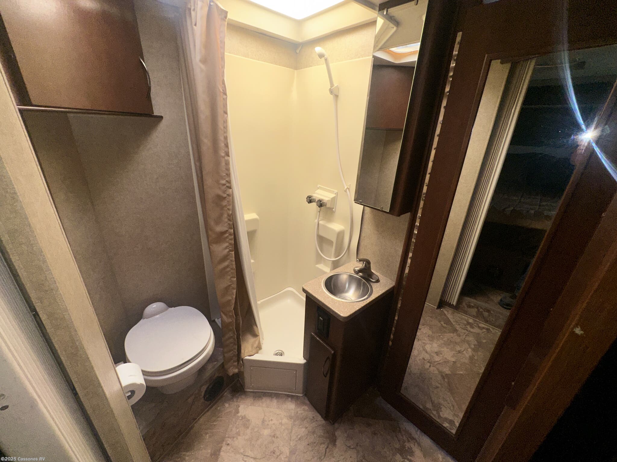 Bunk Beds, Medicine Cabinet, Queen Bed, Roof Vents, Shower, Toilet
