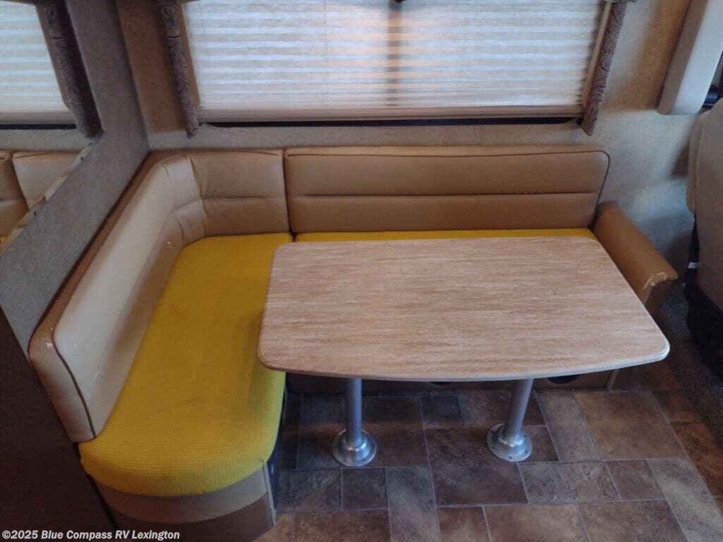 There is an L-shaped sofa with air bed and a pedestal table straight in from the side entry door. From the sofa you can enjoy the 32" TV mounted on the wall above the entry door.