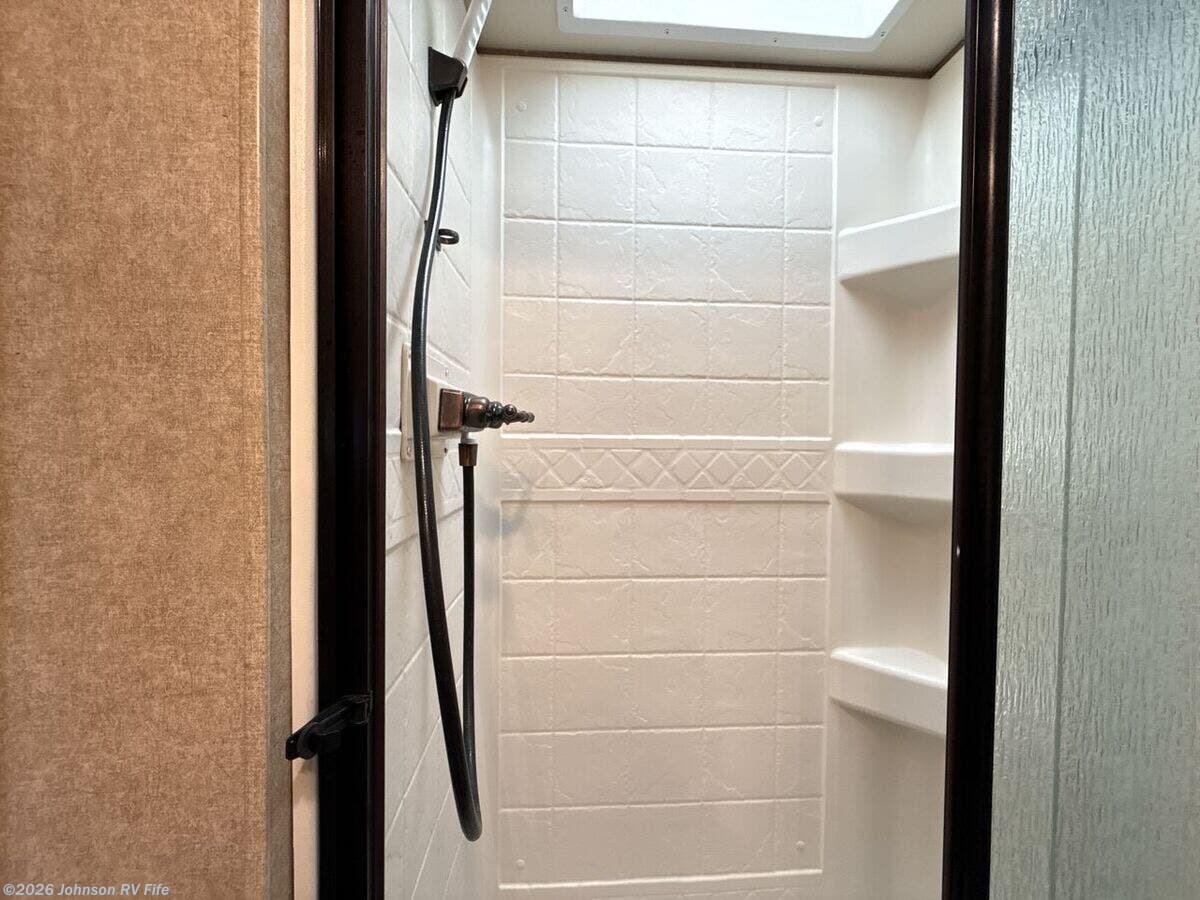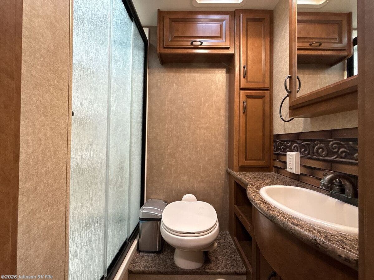 Features Include: Bilstein Shocks, Fog Lights, 8000# Hitch, 7-Pin Cab Features, One-Piece Windshield, Dash Workstation, Back-up Monitor, Tilt Steering Wheel, 82-inch High Ceiling, LED Ceiling Lighting, Frameless Windows, Privacy Shades, Entertainment System, Overhead Cabinets, Pantry, Double Bowl Sink, Designer Backsplash, 3-Burner Cooktop, Gas Oven, OTR Microwave, Systems Center, Large LED TV, Overhead Speakers, Queen or King Bed, Denver Mattress, Designer Headboard, Bedspread, Pillow Shams, TV Prep, Vanity Sink, Linen Storage, Glass Shower Door, Shower Skylight, Porcelain Toilet, 88# LP Tank, 13.5k AC Unit(s), Ceiling Ducted AC, 30k or 35k Furnace, 6-Gal DSI Hot Water, Water Heater Bypass, Vacuum-Bond Laminate, Seamless TPO Roofing, Roof Ladder