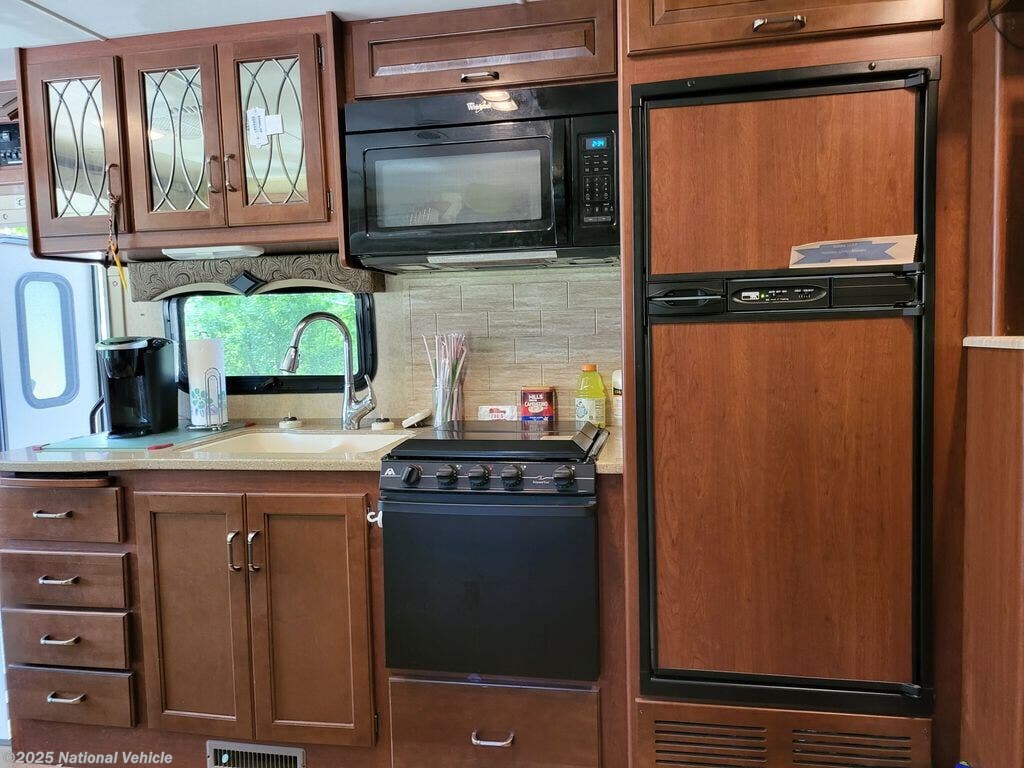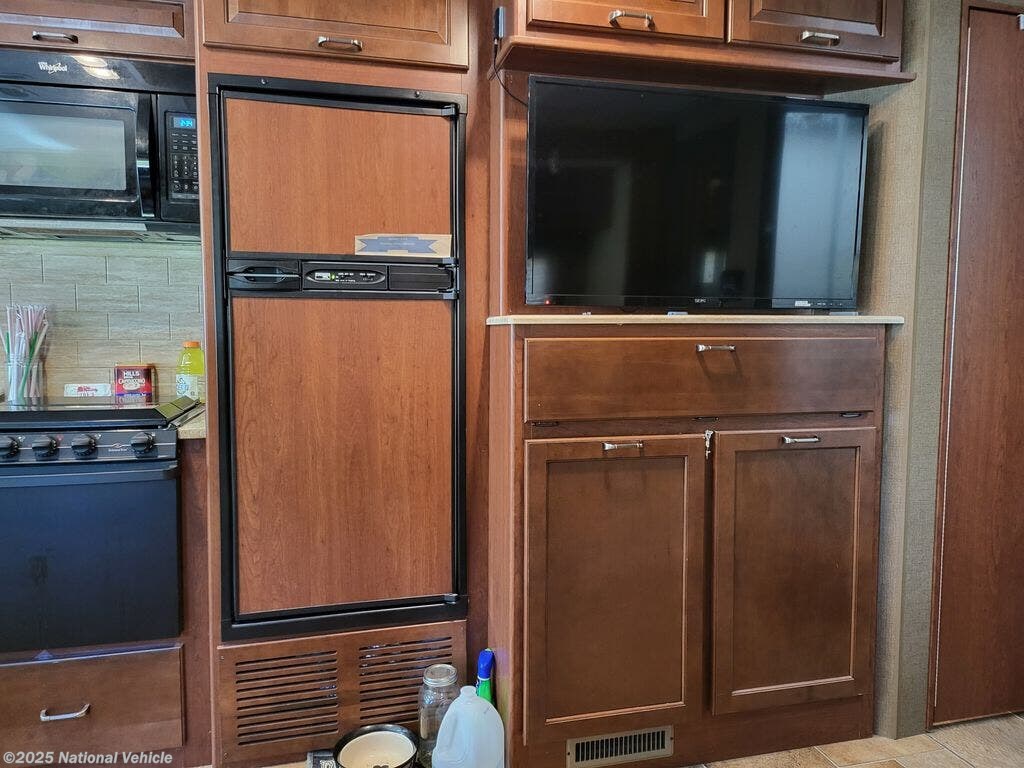 Inside, this coach features a beautifully designed layout with dual slide-outs that create a wide-open living area. The main living space offers a comfortable sofa, booth dinette, and a large entertainment center, perfect for relaxing after a day of exploration. A fully equipped kitchen includes a refrigerator, microwave, stovetop, oven, solid-surface countertops, and generous storage, making it easy to prepare meals wherever your travels take you.