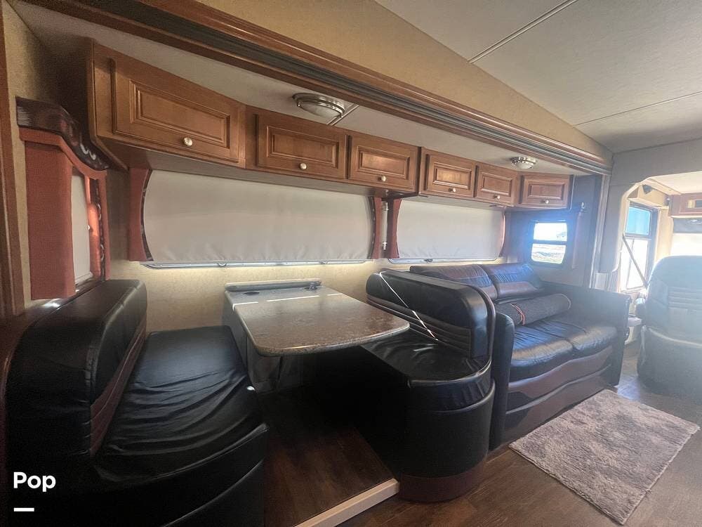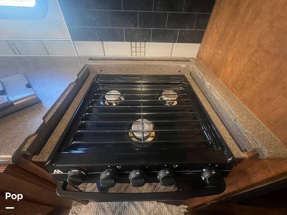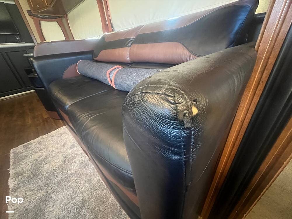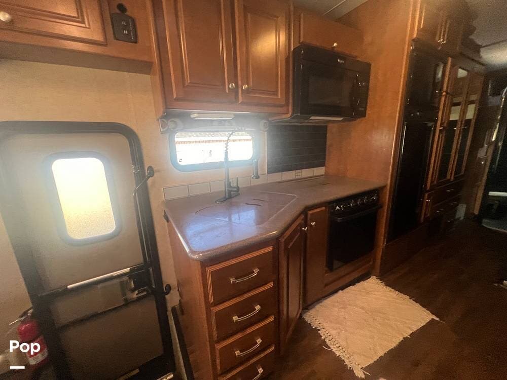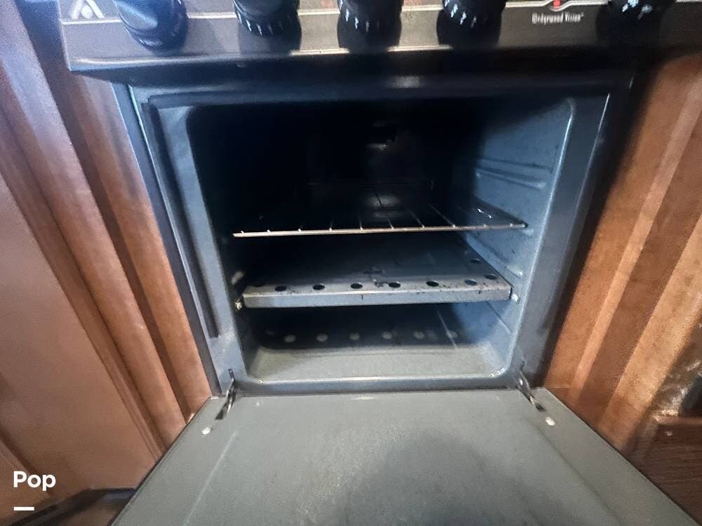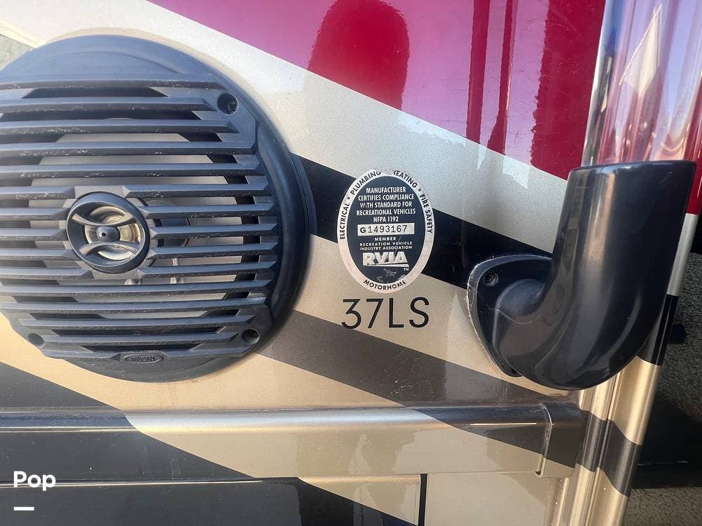 Inside, the 37LS offers a well-appointed living space with high-quality finishes, including leatherette furniture. It has a spacious kitchen with solid-surface countertops, a three-burner gas range, and a residential-style refrigerator.