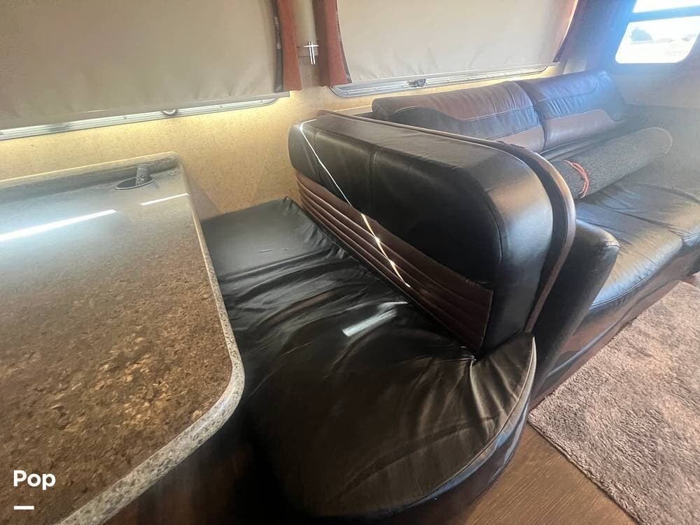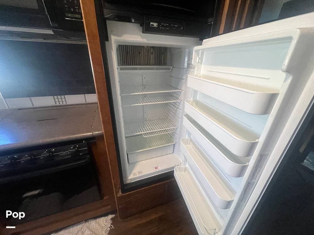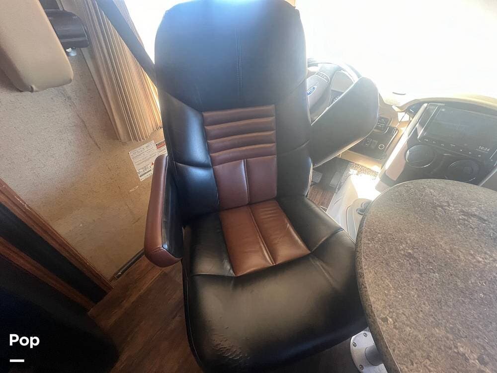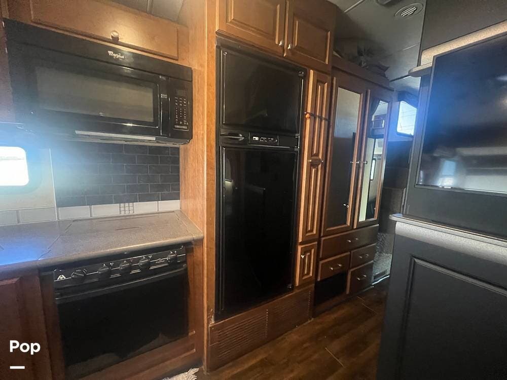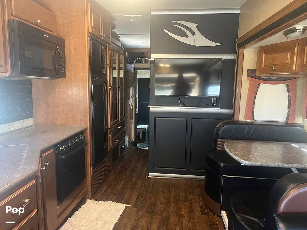 Inside, the 37LS offers a well-appointed living space with high-quality finishes, including leatherette furniture. It has a spacious kitchen with solid-surface countertops, a three-burner gas range, and a residential-style refrigerator.