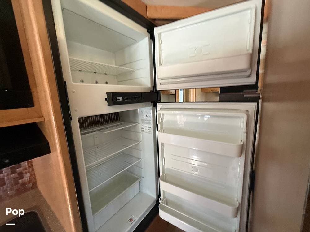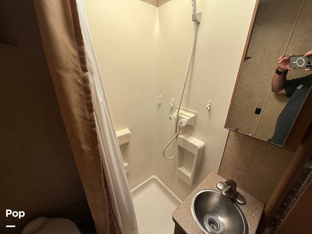 The kitchen features a two-door refrigerator and freezer, and the full bathroom includes a stand-up shower for added convenience.