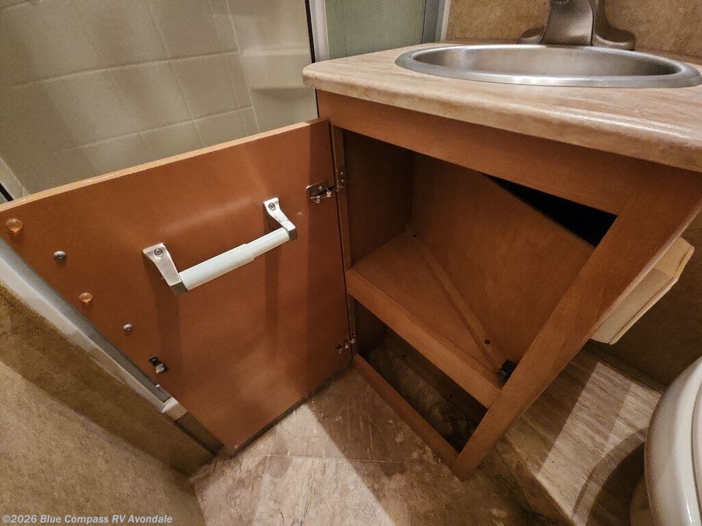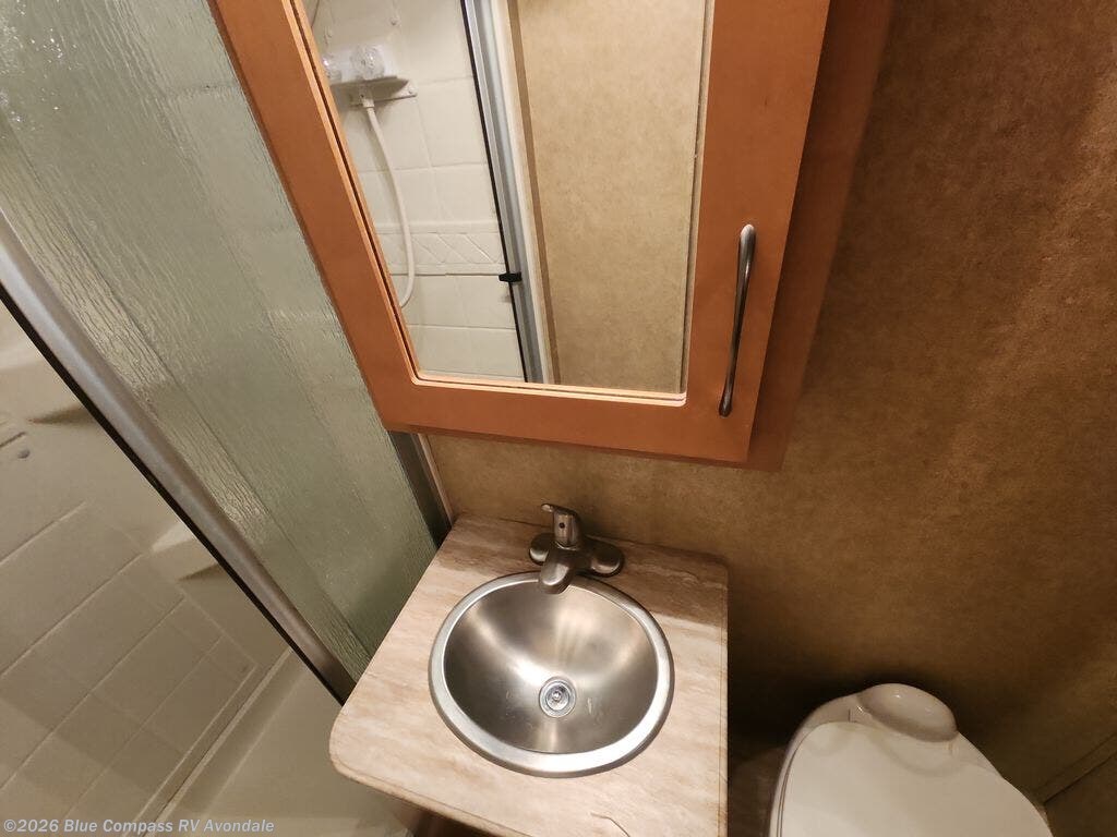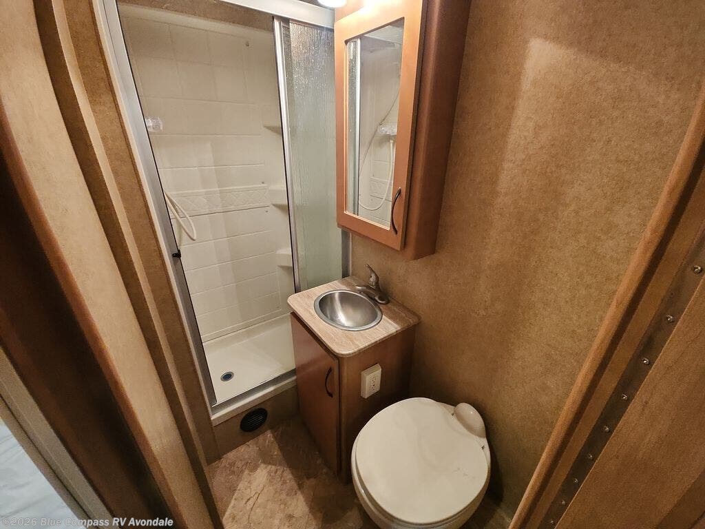 In the rear of the Siesta Sprinter 24SA you will find a corner bathroom including a shower, vanity sink, medicine cabinet, and a toilet. There is a closet just outside the bath. The opposite rear corner holds a full size bed with overhead cabinets and optional 24" LED TV.
