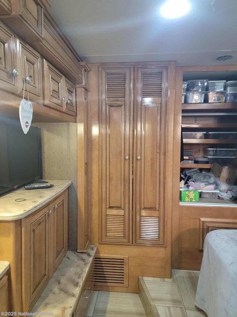A standout highlight of the Tuscany 40KQ is its lavish rear master suite. Enjoy a serene retreat with a king-size bed, full wardrobe, dresser storage, and a dedicated TV. The adjoining large rear bathroom features a spacious shower, solid-surface vanity, elegant lighting, and ample storage. You can access the bathroom both from the bedroom and the mid coach as well.