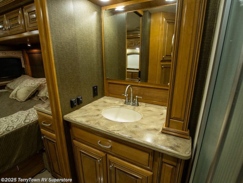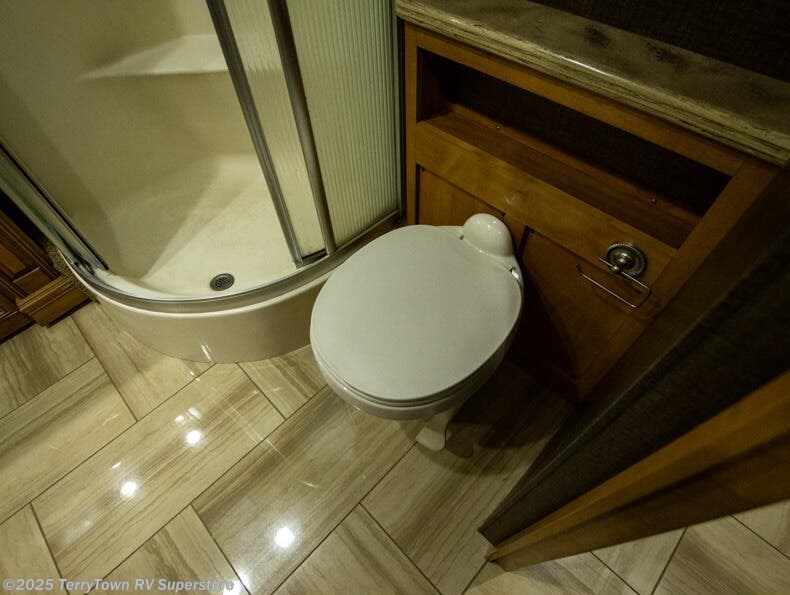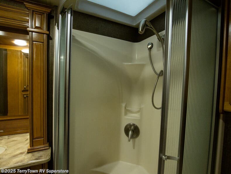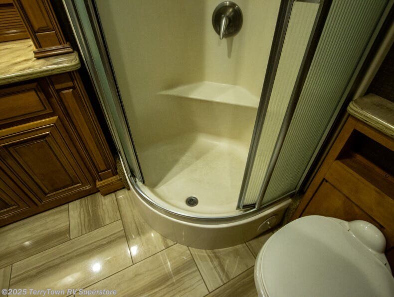 Head down the hall toward the rear of this 40KQ diesel coach and find a full bath on your right including a corner linen cabinet, toilet, corner 36" x 36" shower and slide-out vanity with sink that is part of the bedroom slide. The bath features a second entry door that leads directly into the rear master suite.
