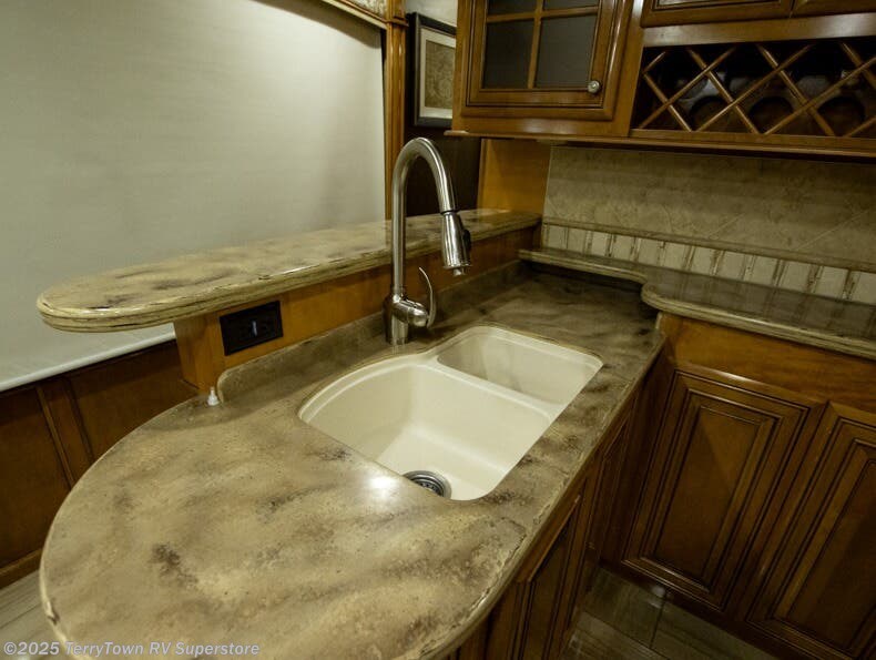 Step inside and see how convenient this unit is with a J-Lounge sofa with queen size air bed slide-out just behind the passenger seat. Across the room you will find a slide-out buffet dinette with retractable 60" TV, refrigerator, pantry, and two burner cook-top with microwave oven above. Along the interior wall there is a wine rack, and raised bar top peninsula with double kitchen sink in the lower counter below.