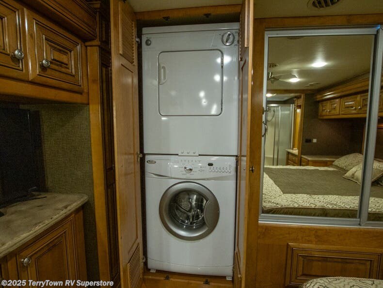 The rear bedroom can also be entered from the hall through a separate sliding door. Inside you will find a slide-out dresser with a 32" TV on your left just inside the door. The rear wall features a stackable washer and dryer for added convenience, and a large wardrobe. A comfortable king size bed slide-out including nightstands, and the bath vanity are opposite the dresser slide and on the right, plus so much more!