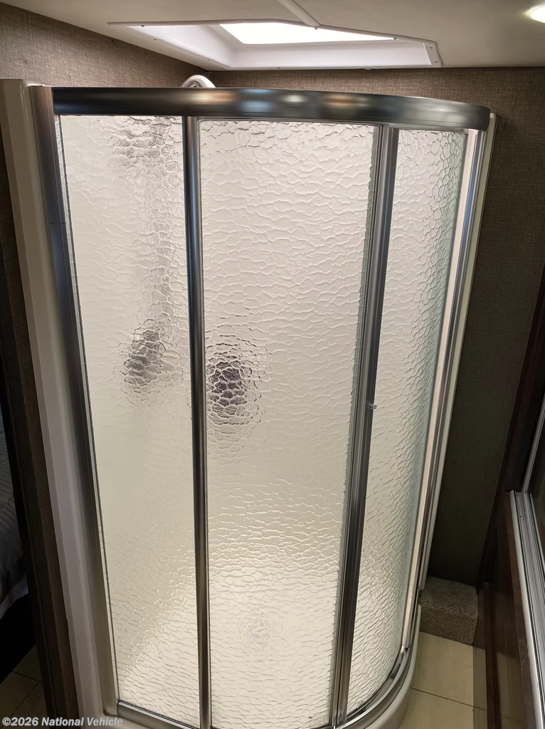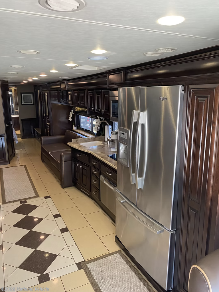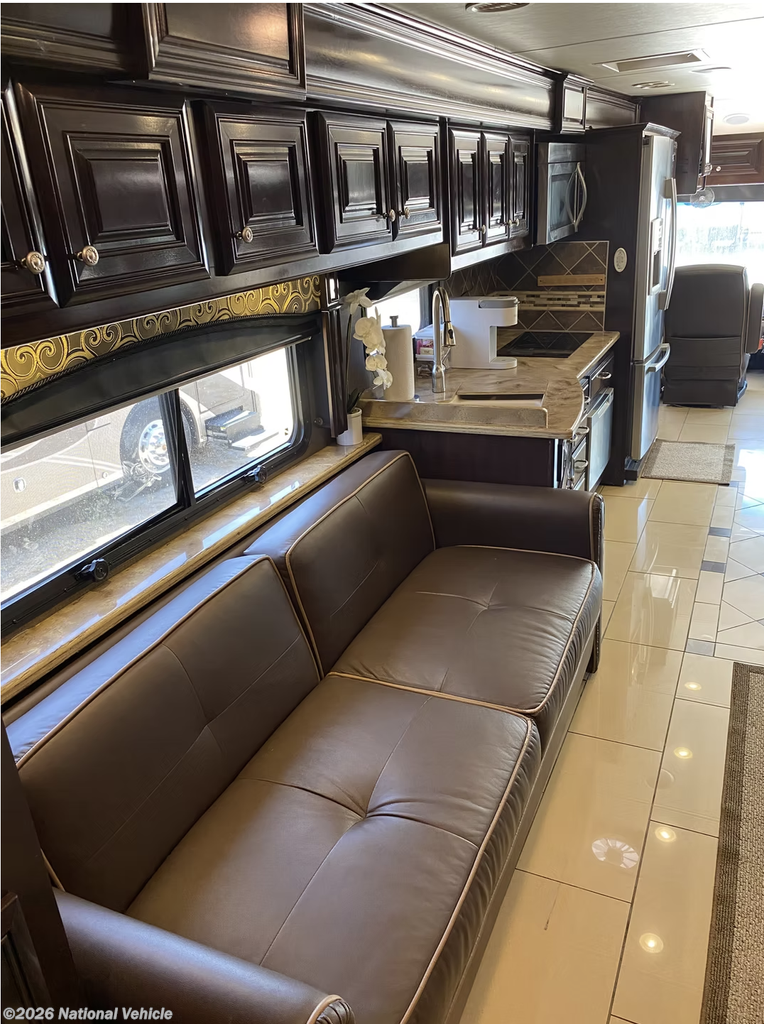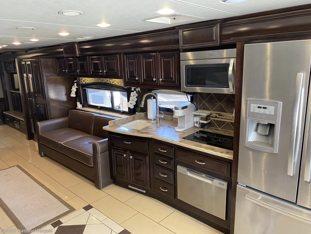 Step inside, and you?ll be greeted by a triple-slide floorplan that offers incredible space and sophistication. The full-wall slide expands the living area into a true home on wheels, featuring polished porcelain tile floors, rich hardwood cabinetry, and elegant LED accent lighting throughout. The main living space offers theater seating, an electric fireplace, and a retractable LED TV, making it the perfect place to unwind. The chef-inspired kitchen includes solid-surface countertops, a residential stainless-steel refrigerator, induction cooktop, convection microwave, and dishwasher, ensuring you can cook and dine in style wherever you go.